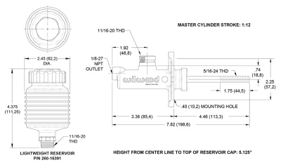 Master Cylinder, 3/4in. Bore, 1.120in. Stroke, Remote Reservoir, Aluminum, Black Paint, Kit.