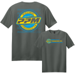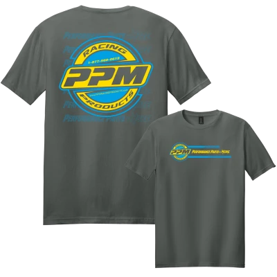 T Shirt, Performance Parts & More, Gray w/ Blue and Yellow, Soft Style, Medium, Each.