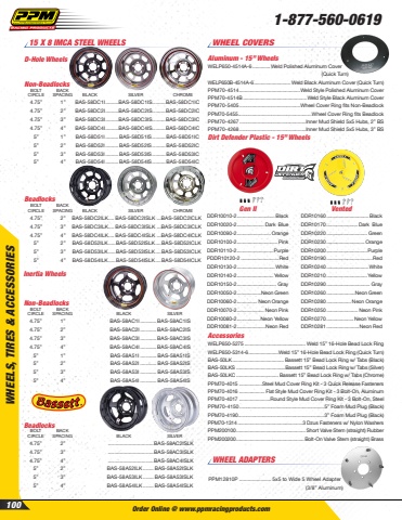 Order Online @ www.ppmracingproducts.comWHEELS, TIRES & ACCESSORIES1-877-560-0619100Aluminum - 15%u201d WheelsWELP650-4514A-6 .............Weld Polished Aluminum Cover (Quick Turn)WELP650B-4514A-6........................... Weld Black Aluminum Cover (Quick Turn)PPM70-4514.............................................Weld Style Polished Aluminum CoverPPM70-4514B...............................................Weld Style Black Aluminum CoverPPM70-5405 ............................................Wheel Cover Ring fits Non-BeadlockPPM70-5455 .....................................................Wheel Cover Ring fits BeadlockPPM70-4267 ................................................Inner Mud Shield 5x5 Hubs, 2%u201d BSPPM70-4268 ................................................Inner Mud Shield 5x5 Hubs, 3%u201d BSDirt Defender Plastic - 15%u201d WheelsAccessoriesWELP650-5275 ............................................. Weld 15%u201d 16-Hole Bead Lock RingWELP650-5314-6......................Weld 15%u201d 16-Hole Bead Lock Ring (Quick Turn)BAS-50LK...................................... Bassett 15%u201d Bead Lock Ring w/ Tabs (Black)BAS-50LKS ....................................Bassett 15%u201d Bead Lock Ring w/ Tabs (Silver)BAS-50LKC ............................... Bassett 15%u201d Bead Lock Ring w/ Tabs (Chrome)PPM70-4015 .................Steel Mud Cover Ring Kit - 3 Quick Release FastenersPPM70-4016 ................... Flat Style Mud Cover Ring Kit - 3 Bolt-On, AluminumPPM70-4017 .......................Round Style Mud Cover Ring Kit - 3 Bolt-On, SteelPPM70-4150 .............................................................5%u201d Foam Mud Plug (Black)PPM70-4190 ..............................................................3%u201d Foam Mud Plug (Black)PPM70-1314 ................................................3 Dzus Fasteners w/ Nylon WashersPPM200100 ...................................................Short Valve Stem (straight) RubberPPM200200..................................................Bolt-On Valve Stem (straight) Brass15 X 8 IMCA STEEL WHEELS WHEEL COVERS4.75%u201d 1%u201d BAS-58DC1I.........BAS-58DC1IS.........BAS-58DC1IC4.75%u201d 2%u201d BAS-58DC2I.........BAS-58DC2IS.........BAS-58DC2IC 4.75%u201d 3%u201d BAS-58DC3I.........BAS-58DC3IS.........BAS-58DC3IC4.75%u201d 4%u201d BAS-58DC4I.........BAS-58DC4IS.........BAS-58DC4IC5%u201d 1%u201d BAS-58D51I .........BAS-58D51IS.........BAS-58D51IC5%u201d 2%u201d BAS-58D52I .........BAS-58D52IS.........BAS-58D52IC 5%u201d 3%u201d BAS-58D53I .........BAS-58D53IS.........BAS-58D53IC5%u201d 4%u201d BAS-58D54I .........BAS-58D54IS.........BAS-58D54ICBLACK SILVER CHROMEBOLTCIRCLEBACKSPACINGD-Hole WheelsNon-Beadlocks4.75%u201d 2%u201d BAS-58DC2ILK.... BAS-58DC2ISLK ...BAS-58DC2ICLK4.75%u201d 3%u201d BAS-58DC3ILK.... BAS-58DC3ISLK ...BAS-58DC3ICLK4.75%u201d 4%u201d BAS-58DC4ILK.... BAS-58DC4ISLK ...BAS-58DC4ICLK5%u201d 2%u201d BAS-58D52ILK.....BAS-58D52ISLK....BAS-58D52ICLK5%u201d 3%u201d BAS-58D53ILK.....BAS-58D53ISLK....BAS-58D53ICLK5%u201d 4%u201d BAS-58D54ILK.....BAS-58D54ISLK....BAS-58D54ICLKBLACK SILVER CHROMEBOLTCIRCLEBACKSPACINGBeadlocks4.75%u201d 1%u201d BAS-58AC1I ...........BAS-58AC1IS4.75%u201d 2%u201d BAS-58AC2I ...........BAS-58AC2IS4.75%u201d 3%u201d BAS-58AC3I ...........BAS-58AC3IS4.75%u201d 4%u201d BAS-58AC4I ...........BAS-58AC4IS5%u201d 1%u201d BAS-58A51I ........... BAS-58A51IS5%u201d 2%u201d BAS-58A52I ........... BAS-58A52IS5%u201d 3%u201d BAS-58A53I ........... BAS-58A53IS5%u201d 4%u201d BAS-58A54I ........... BAS-58A54ISBLACK SILVERBOLTCIRCLEBACKSPACINGInertia Wheels4.75%u201d 2%u201d ...............................BAS-58AC2ISLK4.75%u201d 3%u201d ...............................BAS-58AC3ISLK4.75%u201d 4%u201d ...............................BAS-58AC4ISLK5%u201d 2%u201d BAS-58A52ILK ....... BAS-58A52ISLK5%u201d 3%u201d BAS-58A53ILK ....... BAS-58A53ISLK5%u201d 4%u201d BAS-58A54ILK ....... BAS-58A54ISLKBLACK SILVERBOLTCIRCLEBACKSPACINGNon-BeadlocksBeadlocksWHEEL ADAPTERSPPM12810P ...................... 5x5 to Wide 5 Wheel Adapter(3/8%u201d Aluminum)DDR10010-2 ............................BlackDDR10020-2 .................... Dark BlueDDR10090-2 ......................... OrangeDDR10100-2 .............................. PinkDDR10110-2 ...........................PurplePDDR10120-2 ............................RedDDR10130-2 ............................WhiteDDR10140-2 ...........................YellowDDR10150-2 ............................. GrayDDR10050-2 ..................Neon GreenDDR10060-2 ............... Neon OrangeDDR10070-2 .................... Neon PinkDDR10080-2 .................Neon YellowDDR10081-2 .....................Neon RedDDR10160 ...............................BlackDDR10170 ....................... Dark BlueDDR10220 .............................. GreenDDR10230 ............................ OrangeDDR10200 ..............................PurpleDDR10190 ..................................RedDDR10240 ...............................WhiteDDR10210 ..............................YellowDDR10290 ................................ GrayDDR10260 .....................Neon GreenDDR10280 .................. Neon OrangeDDR10250 ....................... Neon PinkDDR10270 ....................Neon YellowDDR10281 ........................Neon RedGen II Vented