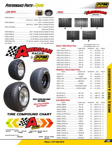 Phone: 1-877-560-0619WHEELS, TIRES & ACCESSORIES101LUG NUTSPPM1200A10 ........................................................... 5/8-11 Double Chamfer(Aluminum - Black Teflon Coated) 10-PackPPM1200A20 ........................................................... 5/8-11 Double Chamfer(Aluminum - Black Teflon Coated) 20-PackGOR-HG13000 ......................................................... 5/8-11 Double Chamfer(Titanium) 20-PackPPM1200S10 ......................................5/8-11 Double Chamfer (Steel) 10-PackPPM1200S20 ......................................5/8-11 Double Chamfer (Steel) 20-PackPPM1210S10 ......................................1/2-20 Steel Lug Nut (Steel) 10-PackPPM1210S20 ......................................1/2-20 Steel Lug Nut (Steel) 20-PackPPM1200-LNS .......................... 12%u201d Spring Loaded Lug Nut Socket - BlackALL10240 ....................................................................... 12%u201d Lug Nut SocketTIRESFBB GA 1Late Model TiresAR28.5-RIB48 .............................. SD-48 15 ..... 28.5/11.0.... AAR29.0-RIB48 .............................. SD-48 15 ..... 29.0/11.0.... AAR29.0-RIB56 ..............................MD-56 15 ..... 29.0/11.0.... AAR29.0-CL48................................ SD-48 15 ..... 29.0/11.0.... FAR29.0-CLPRO3-56...................PRO3/56 15 ..... 29.0/11.0.... FAR29.0-CL56................................MD-56 15 ..... 29.0/11.0.... FAR88.0-PRO2................................PRO2 15 ..... 88.0/11.0.... 1AR88.0-PRO3................................PRO3 15 ..... 88.0/11.0.... 1AR88.0-SPEC48..........................SPEC48 15 ..... 88.0/11.0.... 1AR90.0-PRO2................................PRO2 15 ..... 90.0/11.0.... 1AR92.0-PRO2................................PRO2 15 ..... 92.0/11.0.... 1AR92.0-PRO3................................PRO3 15 ..... 92.0/11.0.... 1AR92.0-PRO3-56 .......................PRO3/56 15 ..... 92.0/11.0.... 1 AR92.0-PRO4................................PRO4 15 ..... 92.0/11.0.... 1 AR92.0-SPEC48..........................SPEC48 15 ..... 92.0/11.0.... 1PART# COMPOUND DIAMETER SIZE TREADModified / Street Stock TiresAR26.5-M................................... MEDIUM 15 ...... 26.5/8.0..... FAR26.5-H...................................... HARD 15 ...... 26.5/8.0..... FAR26.5-SH .......................... STOCKER HARD 15 ...... 26.5/8.0..... FAR27.5-M ................................... MEDIUM 15 ...... 27.5/8.0..... FAR27.5-H...................................... HARD 15 ...... 27.5/8.0..... FAR27.5-SH .......................... STOCKER HARD 15 ...... 27.5/8.0..... FAR27.5-XH.............................. EXTRA HARD 15 ...... 27.5/8.0..... FAR-KK704-S................................ KK-704 15 .......G60-15 ....BB AR-KK704-T ................................ KK-704 15 .......G60-15 ....BBAR-KK704-XT.............................. KK-704 15 .......G60-15 ....BBPART# COMPOUND DIAMETER SIZE TREADDwarf / Mini Stock Tires 8%u201d available in 68%u201d or 71%u201d9.5%u201d available in 69%u201d or 71%u201dAR22.5/8.0-GT23-xx .................... SD-23 13 ...... 22.5/8.0.....GAR22.5/8.0-GT44-xx .................... SD-44 13 ...... 22.5/8.0.....GAR22.5/8.0-GT48-xx .................... SD-48 13 ...... 22.5/8.0.....GAR22.5/8.0-GT57-xx ....................MD-57 13 ...... 22.5/8.0.....GAR22.5/9.5-GT23-xx .................... SD-23 13 ...... 22.5/9.5.....GAR22.5/9.5-GT44-xx .................... SD-44 13 ...... 22.5/9.5.....G AR22.5/9.5-GT48-xx .................... SD-48 13 ...... 22.5/9.5.....G AR22.5/9.5-GT57-xx ....................MD-57 13 ...... 22.5/9.5.....GPART# COMPOUND DIAMETER SIZE TREADOther Tires Available Upon RequestTIRES LISTED ARE WHAT WE STOCK