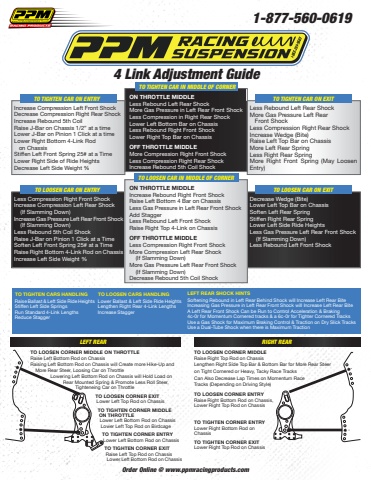1-877-560-0619Order Online @ www.ppmracingproducts.comTO TIGHTEN CARS HANDLINGRaise Ballast & Left Side Ride HeightsStiffen Left Side SpringsRun Standard 4-Link LengthsReduce StaggerTO LOOSEN CARS HANDLINGLower Ballast & Left Side Ride HeightsLengthen Right Rear 4-Link LengthsIncrease StaggerLEFT REAR SHOCK HINTSSoftening Rebound in Left Rear Behind Shock will Increase Left Rear BiteIncreasing Gas Pressure in Left Rear Front Shock will Increase Left Rear BiteA Left Rear Front Shock Can be Run to Control Acceleration & Braking4c-0r for Momentum Cornered tracks & a 6c-0r for Tighter Cornered TracksUse a Gas Shock for Maximum Braking Control & Traction on Dry Slick TracksUse a Dual-Tube Shock when there is Maximum TractionTO TIGHTEN CAR ON ENTRYTO LOOSEN CAR ON ENTRYTO TIGHTEN CAR ON EXITTO LOOSEN CAR ON EXITTO LOOSEN CAR IN MIDDLE OF CORNERIncrease Compression Left Front ShockDecrease Compression Right Rear ShockIncrease Rebound 5th CoilRaise J-Bar on Chassis 1/2%u201d at a timeLower J-Bar on Pinion 1 Click at a time Lower Right Bottom 4-Link Rod on ChassisStiffen Left Front Spring 25# at a TimeLower Right Side of Ride HeightsDecrease Left Side Weight %Less Compression Right Front ShockIncrease Compression Left Rear Shock (If Slamming Down)Increase Gas Pressure Left Rear Front Shock (If Slamming Down)Less Rebound 5th Coil ShockRaise J-Bar on Pinion 1 Click at a TimeSoften Left Front Spring 25# at a TimeRaise Right Bottom 4-Link Rod on ChassisIncrease Left Side Weight %Less Rebound Left Rear ShockMore Gas Pressure Left Rear Front ShockLess Compression Right Rear ShockIncrease Wedge (Bite)Raise Left Top Bar on ChassisMore Left Rear SpringLess Right Rear SpringMore Right Front Spring (May Loosen Entry)Decrease Wedge (Bite)Lower Left Top Bar on ChassisSoften Left Rear SpringStiffen Right Rear SpringLower Left Side Ride HeightsLess Gas Pressure Left Rear Front Shock (If Slamming Down)Less Rebound Left Front ShockON THROTTLE MIDDLELess Rebound Left Rear ShockMore Gas Pressure in Left Rear Front ShockLess Compression in Right Rear ShockLower Left Bottom Bar on ChassisLess Rebound Right Front ShockLower Right Top Bar on ChassisOFF THROTTLE MIDDLEMore Compression Right Front ShockLess Compression Right Rear ShockIncrease Rebound 5th Coil ShockON THROTTLE MIDDLEIncrease Rebound Right Front ShockRaise Left Bottom 4 Bar on ChassisLess Gas Pressure in Left Rear Front ShockAdd StaggerLess Rebound Left Front ShockRaise Right Top 4-Link on ChassisOFF THROTTLE MIDDLELess Compression Right Front ShockMore Compression Left Rear Shock (If Slamming Down)More Gas Pressure Left Rear Front Shock (If Slamming Down)Decrease Rebound 5th Coil ShockTO TIGHTEN CAR IN MIDDLE OF CORNER LEFT REAR RIGHT REARTO LOOSEN CORNER MIDDLE ON THROTTLERaise Left Bottom Rod on ChassisRaising Left Bottom Rod on Chassis will Create more Hike-Up and More Rear Steer, Loosing Car on ThrottleLowering Left Bottom Rod on Chassis will Hold Load on Rear Mounted Spring & Promote Less Roll Steer, Tighteneing Car on ThrottleTO LOOSEN CORNER EXITLower Left Top Rod on ChassisTO TIGHTEN CORNER MIDDLE ON THROTTLELower Left Bottom Rod on ChassisLower Left Top Rod on BirdcageTO TIGHTEN CORNER ENTRYLower Left Bottom Rod on ChassisTO TIGHTEN CORNER EXITRaise Left Top Rod on ChassisLower Left Bottom Rod on ChassisTO LOOSEN CORNER MIDDLERaise Right Top Rod on ChassisLengthen Right Side Top Bar & Bottom Bar for More Rear Steer on Tight Cornered or Heavy, Tacky Race TracksCan Also Decrease Lap Times on Momentum Race Tracks (Depending on Driving Style)TO LOOSEN CORNER ENTRYRaise Right Bottom Rod on Chassis, Lower Right Top Rod on ChassisTO TIGHTEN CORNER ENTRYLower Right Bottom Rod on ChassisTO TIGHTEN CORNER EXITLower Right Top Rod on Chassis4 Link Adjustment Guide