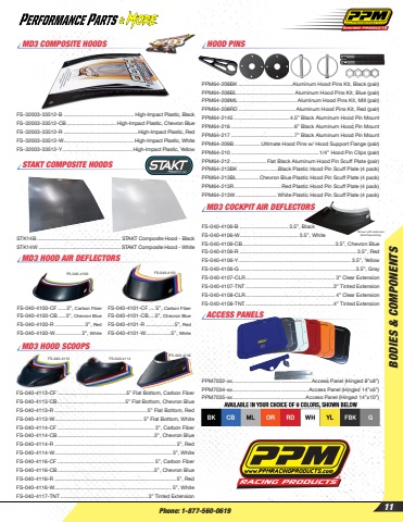 BODIES & COMPONENTSPhone: 1-877-560-0619 11MD3 COCKPIT AIR DEFLECTORSFS-040-4106-B ................................. 3.5%u201d, BlackFS-040-4106-W........................................ 3.5%u201d, WhiteFS-040-4106-CB...............................................................3.5%u201d, Chevron BlueFS-040-4106-R ................................................................................3.5%u201d, RedFS-040-4106-Y............................................................................. 3.5%u201d, YellowFS-040-4106-G ...............................................................................3.5%u201d, GrayFS-040-4107-CLR............................................................. 3%u201d Clear ExtensionFS-040-4107-TNT ............................................................3%u201d Tinted ExtensionFS-040-4108-CLR............................................................. 4%u201d Clear ExtensionFS-040-4108-TNT ............................................................4%u201d Tinted ExtensionShown with extension(Sold Seperately)MD3 COMPOSITE HOODSFS-32003-33512-B ................................................ High-Impact Plastic, BlackFS-32003-33512-CB ..................................High-Impact Plastic, Chevron BlueFS-32003-33512-R ...................................................High-Impact Plastic, RedFS-32003-33512-W ................................................High-Impact Plastic, WhiteFS-32003-33512-Y ................................................High-Impact Plastic, YellowSTAKT COMPOSITE HOODSSTK14B ......................................................... STAKT Composite Hood - BlackSTK14W ........................................................ STAKT Composite Hood - WhitePPM64-208BK .....................................Aluminum Hood Pins Kit, Black (pair)PPM64-208BL ....................................... Aluminum Hood Pins Kit, Blue (pair)PPM64-208ML ........................................Aluminum Hood Pins Kit, Mill (pair)PPM64-208RD .......................................Aluminum Hood Pins Kit, Red (pair)PPM64-2145 ......................................4.5%u201d Black Aluminum Hood Pin MountPPM64-216 ...........................................6%u201d Black Aluminum Hood Pin MountPPM64-217 ...........................................7%u201d Black Aluminum Hood Pin MountPPM64-209B ..................Ultimate Hood Pins w/ Hood Support Flange (pair)PPM64-210 ............................................................1/4%u201d Hood Pin Clips (pair)PPM64-212 ........................ Flat Black Aluminum Hood Pin Scuff Plate (pair)PPM64-213BK ...........................Black Plastic Hood Pin Scuff Plate (4 pack)PPM64-213BL ...............Chevron Blue Plastic Hood Pin Scuff Plate (4 pack)PPM64-213R ................................Red Plastic Hood Pin Scuff Plate (4 pack)PPM64-213W ............................ White Plastic Hood Pin Scuff Plate (4 pack)HOOD PINSFS-040-4100-CF ......3%u201d, Carbon FiberFS-040-4100-CB .....3%u201d, Chevron BlueFS-040-4100-R .................... 3%u201d, RedFS-040-4100-W ..................3%u201d, WhiteFS-040-4100 FS-040-4101FS-040-4101-CF .... 5%u201d, Carbon FiberFS-040-4101-CB ....5%u201d, Chevron BlueFS-040-4101-R ...................5%u201d, RedFS-040-4101-W .................5%u201d, WhiteMD3 HOOD AIR DEFLECTORSFS-040-4113-CF ...............................................5%u201d Flat Bottom, Carbon FiberFS-040-4113-CB..............................................5%u201d Flat Bottom, Chevron BlueFS-040-4113-R ...............................................................5%u201d Flat Bottom, RedFS-040-4113-W............................................................ 5%u201d Flat Bottom, WhiteFS-040-4114-CF .................................................................. 3%u201d, Carbon FiberFS-040-4114-CB..................................................................3%u201d, Chevron BlueFS-040-4114-R ...................................................................................3%u201d, RedFS-040-4114-W................................................................................ 3%u201d, WhiteFS-040-4116-CF .................................................................. 5%u201d, Carbon FiberFS-040-4116-CB..................................................................5%u201d, Chevron BlueFS-040-4116-R ...................................................................................5%u201d, RedFS-040-4116-W................................................................................ 5%u201d, WhiteFS-040-4117-TNT ............................................................3%u201d Tinted ExtensionFS-040-4113 FS-040-4114FS-040-4116MD3 HOOD SCOOPSACCESS PANELSPPM7032-xx ......................................................Access Panel (Hinged 8%u201dx8%u201d)PPM7034-xx ....................................................Access Panel (Hinged 14%u201dx6%u201d)PPM7035-xx ..................................................Access Panel (Hinged 14%u201dx10%u201d)