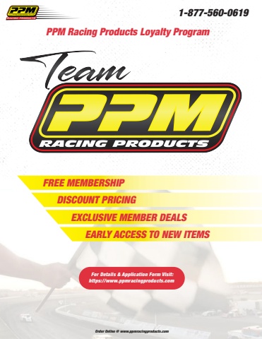 1-877-560-0619Order Online @ www.ppmracingproducts.comFREE MEMBERSHIPDISCOUNT PRICINGEXCLUSIVE MEMBER DEALSEARLY ACCESS TO NEW ITEMS For Details & Application Form Visit: https://www.ppmracingproducts.comPPM Racing Products Loyalty ProgramOrder Online @ www.ppmracingproducts.com