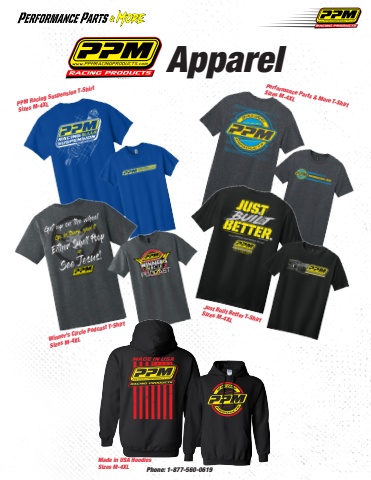 Phone: 1-877-560-0619ApparelPerformance Parts & More T-ShirtSizes M-4XLJust Built Better T-ShirtSizes M-4XLMade in USA HoodiesSizes M-4XLPPM Racing Suspension T-ShirtSizes M-4XLWinner%u2019s Circle Podcast T-ShirtSizes M-4XL