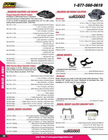 Order Online @ www.ppmracingproducts.comBRAKES & HUBS1-877-560-061914Billet Narrow Mount Dynalite CaliperOnly weighs 4.10 lbs. Stainless steel pistons to resist corrosion & retard the transfer of heat. Black anodized. 7816 Pad.WIL120-11573 ...................................... Billet Narrow Mount Dynalite Caliper 1.75/1.75 Piston 1.25 RotorWIL120-11576 ...................................... Billet Narrow Mount Dynalite Caliper 1.38/1.38 Piston 1.25 RotorWIL120-11572 ...................................... Billet Narrow Mount Dynalite Caliper 1.75/1.75 Piston .810 RotorWIL120-11578 ...................................... Billet Narrow Mount Dynalite Caliper 1.12/1.12 Piston .810 Rotor WIL120-11575 ........................................................................... FNDL Caliper1.38/1.38 Piston .810 RotorWIL300-6588 ............................................. Caliper Spacer Kit - NDL, NDP, FNDLWIL300-6589 .............................Caliper Spacer Kit - NDL, NDP, FNDL .810 RotorWIL240-4385 ....................Caliper Shims .441 ID x 1.003 OD x .030 Thick 10pk.WIL240-4386 .....................Caliper Shims .477 ID x .922 OD x .063 Thick 10pk.WIL240-4387 ......................................Caliper Shims 7/16%u201d ID x .015 Thick 10pk.Forged Superlite FSLI/ST CaliperAvailable in differential bore or standard symmetrical bore configurations. Fits rotors from 11.75%u201d to 13.00%u201d in diameter, and widths from .81%u201d to 1.25%u201d. Long lasting black anodized finish. 7420 Pad.WILWOOD CALIPERS LUG MOUNTWIL120-11134 ............................................Forged Superlite FSLI/ST Caliper 1.75/1.75 Piston .810 RotorWIL120-11136 ............................................Forged Superlite FSLI/ST Caliper 1.75/1.75 Piston 1.25 RotorWIL120-11128 ............................................Forged Superlite FSLI/ST Caliper 1.38/1.38 Piston .810 RotorWIL120-11130 ............................................Forged Superlite FSLI/ST Caliper 1.38/1.38 Piston 1.25 RotorWIL130-2427 ........................................................O-Ring Kit, Superlite 1.88/1.75 FSL4/ST, Set of 4 WIL130-2655 .........................................................................O-Ring Kit, Superlite 1.75 FSL4/ST, 4pkWIL130-2658 .........................................................................O-Ring Kit, Superlite 1.38 FSL4/ST, 4pkWIL130-4346 .........................................................................O-Ring Kit, Superlite 1.62 FSL4/ST, 4pkWIL300-5922 ...........................................Wear Plate, Superlite 6/FSL Caliper, RH WIL300-5923 ............................................Wear Plate, Superlite 6/FSL Caliper, LHPPM120-0125 ...........................Brake Pad Spacer (SL) 1/8%u201dThick AluminumRADIAL MOUNT CALIPERSWIL120-13826 .......................... RH Forged Superlite 4 Radial Mount Caliper 1.88/1.75%u201d Pistons, .81%u201d Rotor (7820 Pad)WIL120-13827 ...........................LH Forged Superlite 4 Radial Mount Caliper 1.88/1.75%u201d Pistons, .81%u201d Rotor (7820 Pad)WIL120-15563SI .....................................Billet Narrow Dynalite Radial Mount 1.38 Pistons, .81%u201d Rotor (7816 Pad)WIL120-15565SI .....................................Billet Narrow Dynalite Radial Mount 1.62 Pistons, .81%u201d Rotor (7816 Pad)WIL120-14765SI .....................................Billet Narrow Dynalite Radial Mount 1.88 Pistons, .81%u201d Rotor (7816 Pad)WILWOOD GM BRAKE CALIPERSAluminumWIL120-13900 ..........................................................Caliper GM Metric Race12.19 x 1.040, 2.5%u201d Piston, D154 PadWIL120-14876 ..........................................................Caliper GM Metric Race12.19 x 1.040, 2.0%u201d Piston, D154 PadWIL120-15612.......................................................Caliper GM D52-R Floater12.19 x 1.250, 2.75%u201d Piston, D52 Pad IronWIL120-16101 ................................................................... Caliper GM Metric11.75 x 1.040, 2.5%u201d Piston, D154 PadWIL120-8924 ..................................................................... Caliper GM Metric11.75 x 1.040, 2.75%u201d Piston, D154 PadWIL120-9333 ..................................................................... Caliper GM Metric11.75 x 1.040, 2.0%u201d Piston, D154 PadWIL230-0619 ........................................................ GM Caliper Bolt Kit, Slide 4pk.PPM154-42079 ..................................................... GM Caliper Bolt Kit, Slide PairPPM1530-SL .................................................................3.5%u201d Mount 3%u201d ClampSteelBrake Mounts are made of aircraft grade billet aluminum. They include 3/8%u201d double pin holes. Designed to eliminate flex, and available in 11-3/4%u201d and 12%u201d rotor designs.** PIN BOLTS NOT INCLUDED **AluminumPPM1530GM PPM1530MGMPPM1530-SL3-1/2%u201dPPM1530GM .............................................................. Steel GM Brake MountPPM1530MGM ................................................Steel GM Metric Brake Mount** PIN BOLTS NOT INCLUDED **BRAKE MOUNTSWIL250-14767 .................................Caliper Mounting Kit w/Bracket-BNDLR11.75 to 12.19%u201d Rotor, Sprint CarWIL250-6309 ................................................ Caliper Mounting Kit w/BracketSL6R-3.50%u201d MountWIL250-14767 WIL250-6309RADIAL MOUNT CALIPER BRACKET KITS