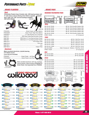 Phone: 1-877-560-0619BRAKES & HUBS15BRAKE PADS4.74 (120.4)3.96 (100.6)2.43 (61.7)2.21 (56.0)7420 PAD.80(20.3)4.74 (120.4)7320 PAD 2.43 (61.7).80(20.3).60(15.2)7816 PADWILWOOD POLYMATRIX PADS7816WIL150-20-7816K ....................................BP-20, 7816 DynaPro Radial, NDLWIL150-28-7816K ...................................BP-28, 7816 DynaPro Radial, NDLWIL150-30-7816K ....................................BP-30, 7816 DynaPro Radial, NDLWIL150-35-7816K ....................................BP-35, 7816 DynaPro Radial, NDLWIL150-40-7816K ....................................BP-40, 7816 DynaPro Radial, NDLPFR97-7816K ...........................................................................97 Compound7420WIL150-20-7420K ....................................................BP-20, 7420 FSL, SL4/6WIL150-28-7420K ....................................................BP-28, 7420 FSL, SL4/6WIL150-30-7420K ....................................................BP-30, 7420 FSL, SL4/6WIL150-35-7420K ....................................................BP-35, 7420 FSL, SL4/6WIL150-40-7420K ....................................................BP-40, 7420 FSL, SL4/6WIL150-2392K ...................... Gator Compound - Medium, 7420 FSL, SL4/6PFR97-7420K ...........................................................................97 CompoundD52WIL150-30-D52K ..................................................................... BP-30, D52 GM3WIL150-40-D52K ......................................................................BP-40, D52 GM3D154WIL150-10-D154K ................................................................BP-10, D154 Metric WIL150-20-D154K ................................................................BP-20, D154 MetricWIL150-28-D154K ...............................................................BP-28, D154 MetricWIL150-30-D154K ................................................................BP-30, D154 MetricWIL150-35-D154K ................................................................BP-35, D154 MetricWIL150-40-D154K ................................................................BP-40, D154 Metric4.74 (120.4)3.96 (100.6)2.43 (61.7)2.21 (56.0)7420 PAD.80(20.3)4.74 (120.4)7320 PAD 2.43 (61.7).80(20.3).60(15.2)7816 PADD52 D154PPM2595LK Black anodized aluminum, double bearing, 3.5%u201d Brake mount. Lock ring not included.PPM2595 ...................................... Brake Floater - Left RearPPM2595LK .................................. Brake Floater Lock RingPPM2595Black anodized aluminum with ring, bushings, bolts & washers. Allows locking of PPM2595 LR Brake Floater. Sold separately from PPM2595.PPM4025L PPM4025RSteelPPM Brake Floaters have 2 double roller .008 bearing design with 2\left or right. 3/4\GM metric Brakes. PPM4025L ...................................................Brake Floater Left Rear (Metric)PPM4025R ................................................Brake Floater Right Rear (Metric)PPM4055-1 .............................................1/4%u201d Step Bushing 3/4 to 5/8 HoleBSB7070 ........................................BSB Steel Single Bearing Brake FloaterBSB7088 ...................................BSB Steel 2.5%u201d Dual Bearing Brake FloaterBSB7090 ...................................BSB Steel 3.5%u201d Dual Bearing Brake FloaterBSB7070-1.......................................................................7070 Caliper PlateBSB7070-3.................................................................................... 7070 HubBSB7090-1..............................................................................................ArmBSB7090-2................................................................................Caliper PlateBSB7090BSB7088AluminumBRAKE FLOATERS