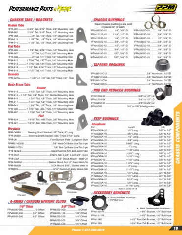 Phone: 1-877-560-0619CHASSIS COMPONENTS19A-ARMS / CHASSIS UPRIGHT SLUGSSTEP BUSHINGSCHASSIS BUSHINGSPPM38250-10 ...........1/4%u201d, 3/8%u201d ID PPM12125-10 ........1 1/4%u201d, 1/2%u201d IDPPM12250-10 ...........1/4%u201d, 1/2%u201d IDPPM12375-10 ...........3/8%u201d, 1/2%u201d ID PPM12500-10 ...........1/2%u201d, 1/2%u201d IDPPM12750-10 ...........3/4%u201d, 1/2%u201d IDPPM58100-10 .......... 100%u201d, 5/8%u201d IDPPM58200-10 .......... 200%u201d, 5/8%u201d IDPPM58250-10 ...........1/4%u201d, 5/8%u201d IDPPM58330-10 ...........3/8%u201d, 5/8%u201d IDPPM58500-10 ...........1/2%u201d, 5/8%u201d IDPPM58625-10 ...........5/8%u201d, 5/8%u201d IDPPM58750-10 ...........3/4%u201d, 5/8%u201d IDPPM34250-10 ...........1/4%u201d, 3/4%u201d IDPPM34500-10 ...........1/2%u201d, 3/4%u201d IDPPM34750-10 ...........3/4%u201d, 3/4%u201d IDSteel chassis bushings are sold in packs of 10 eachROD END REDUCER BUSHINGSPPM1258-34 ................................................. 5/8%u201d to 1/2%u201d I.DPPM1234-34 ................................................. 3/4%u201d to 1/2%u201d I.DPPM5834-34 ................................................. 3/4%u201d to 5/8%u201d I.DPPM4058...................................... 3/4%u201d to 5/8%u201d MisalignmentTAPERED BUSHINGSPPM0310-C12............................................................3/8%u201d Aluminum, 1/2%u201dIDPPM0310-C58............................................................3/8%u201d Aluminum, 5/8%u201dIDPPM0310-C34............................................................3/4%u201d Aluminum, 3/4%u201dIDPPM581500-C...............................................................2%u201d Aluminum, 5/8%u201dIDPart Length I.D.PPM4062A-10.............................. 1/4%u201d Long ............................... 5/8%u201d to 1/2%u201dPPM4080A-10.............................. 3/8%u201d Long ............................... 5/8%u201d to 1/2%u201dPPM4065A-10...............................1/2%u201d Long............................... 5/8%u201d to 1/2%u201dPPM4085A-10...............................5/8%u201d Long............................... 5/8%u201d to 1/2%u201dPPM4087A-10............................ 0.685%u201d Long ............................. 5/8%u201d to 1/2%u201dPPM4090A-10................................1%u201d Long................................. 5/8%u201d to 1/2%u201dPPM4091A-10............................ 1-1/8%u201d Long ............................. 5/8%u201d to 1/2%u201dPPM4092A-10............................ 1-3/4%u201d Long ............................. 5/8%u201d to 1/2%u201dPPM4095A-10............................ 1-1/4%u201d Long ............................. 5/8%u201d to 1/2%u201dPPM4096-10 .............................. 1-1/2%u201d Long ............................. 5/8%u201d to 1/2%u201dPPM4097A-10............................ 1.375%u201d Long ............................. 5/8%u201d to 1/2%u201dPPM4098A-10................................2%u201d Long................................. 5/8%u201d to 1/2%u201dPPM4099A-10.............................2 1/2%u201d Long.............................. 5/8%u201d to 1/2%u201dPPM4059A-10.............................. 1/4%u201d Long ............................... 3/4%u201d to 1/2%u201dPPM4055A-10.............................. 1/4%u201d Long ............................... 3/4%u201d to 5/8%u201dPPM4060A-10..............................9/16%u201dLong............................... 3/4%u201d to 5/8%u201dPPM4070A-10.............................. 5/8%u201d Long ............................... 3/4%u201d to 5/8%u201dPPM4075A-10............................11 /16%u201d Long............................. 3/4%u201d to 5/8%u201dAluminumSold in packs of 10PPM-024BJPPM-066BKPPM-050TPPM-6000M PPM437-7251PPM7015BracketsPPM-066BK .........Steering Shaft Bracket,1/8%u201d Thick, 8%u201d LongPPM-069BK ..........Steering Shaft Bracket, .085%u201d Thick 2-1/4%u201d LongPPM-061.....................................................Front Bumper Plate - Longhorn StylePPM437-60030 ..............................................5/8%u201d Weld-On Brake Line Tab 4-pkPPM437-7251 ..................................................5/8%u201d Bolt On Brake Line Tab 2-pkPPM-024BJ ............................................. Upper Control Arm Ball Joint PlatePPM-050T ............................................. Engine Tab, 3 3/8%u201d L w/2 3/8%u201d HolesPPM-076A ........................................................... 1 5/8%u201d Shock Mount - Weld-OnPPM-263SM.........................................Radius Shock Mnt (1%u201d Gap) Weld-OnPPM-6000M ............................................ UCA Mount 3/16%u201d, Slotted Weld InPPM7015 .................................................... 3/16%u201d Aluminum Body Brace TabRadius TabsPPM-601 ............ 2 3/8%u201d Tall, 3/16%u201d Thick, 3/8%u201d Mounting HolePPM-602 ............. 2 3/8%u201d Tall, 3/16%u201d Thick, 1/2%u201d Mounting HolePPM-603 .....................2%u201d Tall, 1/8%u201d Thick, 1/4%u201d Mounting HolePPM-610 ...............1 1/8%u201d Tall, 1/8%u201d Thick, 1/4%u201d Mounting HolePPM-611 ...............1 1/8%u201d Tall, 1/8%u201d Thick, 3/8%u201d Mounting HoleFlat TabsPPM-606 ............. 1 7/8%u201d Tall, 3/16%u201d Thick, 1/2%u201d Mounting HolePPM-607 .....................2%u201d Tall, 1/4%u201d Thick, 3/8%u201d Mounting HolePPM-608 .....................2%u201d Tall, 1/4%u201d Thick, 1/2%u201d Mounting HolePPM-612 ............ 1 7/16%u201d Tall, 1/8%u201d Thick, 1/4%u201d Mounting HolePPM-613 ............ 1 7/16%u201d Tall, 1/8%u201d Thick, 3/8%u201d Mounting HolePPM-618 ............ 1 1/2%u201d Tall, 3/16%u201d Thick, 1/2%u201d Mounting HolePPM-619 .............. 1 1/2%u201d Tall, 1/4%u201d Thick, 1/2%u201d Mounting HoleGussetsPPM-621G ............... 1 7/8%u201d x 1 7/8%u201d Tall, 1/8%u201d Thick, 1/2%u201d HoleBody Brace TabsRoundPPM-614 ............... 1 1/2%u201d Tall, 1/8%u201d Thick, 1/4%u201d Mounting HolePPM-615 ... 1 1/2%u201d Tall, 1/8%u201d T
