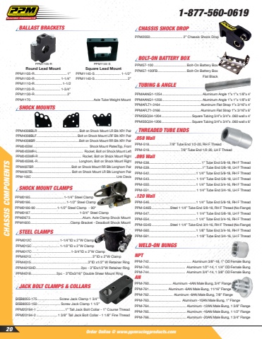 Order Online @ www.ppmracingproducts.comCHASSIS COMPONENTS1-877-560-061920SHOCK MOUNT CLAMPSPPM0185................................... 1-1/4%u201d Steel ClampPPM0186......................................1-1/2%u201d Steel ClampPPM0186-90 ......................1-1/2%u201d Steel Clamp - 90%u00b0PPM0187................................................... 1-3/4%u201d Steel ClampPPM2673 .......................................................Alum. Axle Clamp Shock MountPPM1600 ..........................................Clamp Bracket - Deadbolt Shock MountSTEEL CLAMPSPPM012C .............................1-1/4%u201dID x 2%u201dW ClampPPM015C .............................1-1/2%u201dID x 2%u201dW ClampPPM017C .........................................1-3/4%u201dID x 2%u201dW ClampPPM4013................................................................ 3%u201d`ID x 2%u201dW ClampPPM4015............................................................3%u201dID x1/2%u201d W Retainer RingPPM4015HD............................................... 2pc - 3%u201dIDx1/2%u201dW Retainer RingPPM4018.......................... 2pc - 3%u201dIDx3/16%u201d Double Shear Mount RingJACK BOLT CLAMPS & COLLARSBSB8055-175 .......................Screw Jack Clamp 1 3/4%u201dBSB8055-150 ........................ Screw Jack Clamp 1 1/2%u201dPPM20194-1 ..............................1%u201d Tall Jack Bolt Collar - 1%u201d Course ThreadPPM20194-2 ...................... 1 3/8%u201d Tall Jack Bolt Collar - 1 1/8%u201d Fine ThreadCHASSIS SHOCK DROP PPM2050.................................. 2%u201d Chassis Shock DropBOLT-ON BATTERY BOXPPM57-100 ..................................Bolt-On Battery BoxPPM57-100FB..............................Bolt-On Battery BoxFlat BlackTHREADED TUBE ENDS.058 WallPPM-518 .......................7/8%u201d Tube End 1/2-20, RH F ThreadPPM-519 ................................... 7/8%u201d Tube End 1/2-20, LH F Thread.095 WallPPM-538 ........................................................... 1%u201d Tube End 5/8-18, RH F ThreadPPM-539 ............................................................1%u201d Tube End 5/8-18, LH F ThreadPPM-542 .....................................................1 1/4%u201d Tube End 5/8-18, RH F ThreadPPM-543 ..................................................... 1 1/4%u201d Tube End 5/8-18, LH F ThreadPPM-550 .....................................................1 1/4%u201d Tube End 3/4-16, RH F ThreadPPM-551 ..................................................... 1 1/4%u201d Tube End 3/4-16, LH F Thread.120 WallPPM-546 .....................................................1 1/4%u201d Tube End 5/8-18, RH F ThreadPPM-546S .....................Steel 1 1/4%u201d Tube End 5/8-18, RH F Thread (No Flange)PPM-547 ..................................................... 1 1/4%u201d Tube End 5/8-18, LH F ThreadPPM-554 .....................................................1 1/4%u201d Tube End 3/4-16, RH F ThreadPPM-554S .....................Steel 1 1/4%u201d Tube End 3/4-16, RH F Thread (No Flange)PPM-560 .....................................................1 1/8%u201d Tube End 3/4-16, RH F ThreadPPM-561 ..................................................... 1 1/8%u201d Tube End 3/4-16, LH F ThreadWELD-ON BUNGSNPTPPM-742 ................................................ Aluminum 3/8%u201d-18, 1%u201d OD Female BungPPM-743 ......................................... Aluminum 1/2%u201d-14, 1 1/4%u201d OD Female BungPPM-744 ......................................... Aluminum 3/4%u201d-14, 1 3/8%u201d OD Female BungANPPM-760 .......................... Aluminum -4AN Male Bung, 3/4%u201d FlangePPM-761 ..................... Aluminum -6AN Male Bung, 11/16%u201d FlangePPM-762 ........................... Aluminum -8AN Male Bung, 7/8%u201d FlangePPM-763 .................................... Aluminum -10AN Male Bung, 1%u201d FlangePPM-764 .......................................... Aluminum -12AN Male Bung, 1 3/8%u201d FlangePPM-765 .......................................... Aluminum -16AN Male Bung, 1 1/2%u201d FlangePPM-766 .......................................... Aluminum -20AN Male Bung, 1 3/4%u201d FlangeTUBING & ANGLEPPMAANG1-1254............................................. Aluminum Angle 1%u201dx 1%u201dx 1/8%u201dx 4%u2019PPMAANG1-1256............................................. Aluminum Angle 1%u201dx 1%u201dx 1/8%u201dx 6%u2019PPMAFLT1-3164.............................................Aluminum Flat Strap 1%u201dx 3/16%u201dx 4%u2019PPMAFLT1-3166.............................................Aluminum Flat Strap 1%u201dx 3/16%u201dx 6%u2019PPMSSQ34-1204..................................Square Tubing 3/4%u201dx 3/4%u201dx .060 wall x 4%u2019PPMSSQ34-1206..................................Square Tubing 3/4%u201dx 3/4%u201dx .060 wall x 6%u2019Round Lead MountPPM1105-R ..................................1%u201dPPM1100-R ........................... 1-1/4%u201d PPM1110-R .............................1-1/2PPM1120-R ........................... 1-3/4%u201dPPM1130-R ..................................2%u201dSquare Lead MountPPM1145-S ........................... 1-1/2%u201dPPM1140-S ..................................2%u201dPPM1105-R PPM1145-SPPM1170 ..................................................................Axle Tube Weight MountBALLAST BRACKETSPPM4008BLR .............................................Bolt on Shock Mount LR Blk XR1 PairPPM4008BLF ............................................Bolt on Shock Mount LRF Blk XR1 PairPPM4008BR ...............................................Bolt on Shock Mount RR Blk XR1 PairPPM045SM .................................................................. Shock Mount PlatesTop, FrontPPM045SMR-L ...................................................... Rocket, Bolt on Shock Mount LeftPPM045SMR-R ................................................... Rocket, Bolt on Shock Mount RightPPM045SML-R ................................................ Longhorn, Bolt on Shock Mount RightPPM4007BR ..............