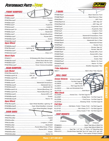 Phone: 1-877-560-0619CHASSIS COMPONENTS21DOOR BARSPPMBDDoorBar .....................................................................Black DiamondPPMCPDoorBar ..................................................................................CapitalPPMGDoorBar.........................................................................................GRTPPMLDoorBar ...................................................................Longhorn, 3 PiecePPMMDoorBar ............................................................................. MastersbiltPPMRDoorBar....................................................Rocket (Blue/Gray), 3 PiecePPMRXDoorBar........................................................... Rocket (XR1), 3 PiecePPMSWDoorBar..................................................................................SwartzPPMWGDoorBar ...........................................................................Warrior 1GT-BARSPPMBDTBarF..............................................................Black Diamond, FrontPPMBDTBarR...............................................................Black Diamond, RearPPMGTBarF ..................................................................................GRT, FrontPPMGTBarR-35 ...................................................................... GRT, Rear 35%u201dPPMGTBarR-39 ......................................................................GRT, Rear, 39%u201dPPMKTbarF.........................................................................Kryptonite, FrontPPMKTbarR..........................................................................Kryptonite, RearPPMLTbarF........................................................................... Longhorn, FrontPPMLTbarR ........................................................................... Longhorn, RearPPMMTBarF..................................................Mastersbilt Smackdown, FrontPPMMTBarR ..................................................Mastersbilt Smackdown, RearPPMMXTBarR ..........................................................Mastersbilt Gen X, RearPPMXSTBarR................................................................. Mastersbilt XS RearPPMRTBarF.............................................................................. Rocket, FrontPPMRTBarR-34...................................................................Rocket, Rear 34%u201dPPMRTBarR-36...................................................................Rocket, Rear 39%u201dPPMRXTBarF ..................................................................Rocket (XR1), FrontPPMRXTBarR...................................................................Rocket (XR1), RearPPMSWTbarF............................................................................Swartz, FrontPPMSWTbarR ........................................................................... Swartz, RearPPMWGTbarF .................................................................... Warrior 1G, FrontPPMWGTbarR..................................................................... Warrior 1G, RearWM468-A .............................................................. Modifed Adjustable T-BarT-Bar AdjustersWM411 ................................................................Wehr%u2019s Rear T-Bar AdjusterFRONT BUMPERSLatemodelPPMBDumperF ......................................................................Black DiamondPPMCPBumperF.................................................................................CapitalPPMGBumperF .......................................................................................GRTPPMKBumperF ............................................................................. KryptonitePPMLBumperF................................................................................LonghornPPMLBumperF-24 ...................................................... Longhorn (New Style)PPMMBumperF............................................................................ MastersbiltPPMRBumperF ................................................................Rocket (Blue/Gray)PPMRXBumperF .......................................................................Rocket (XR1)PPMSWBumperF ................................................................................SwartzPPMWGBumperF..........................................................................Warrior 1GOpen WheelPPMBMBumperF ......................................BMFPPMLTBumperF ...........................Lightning 19%u2019PPMSHBumperF......................................ShawPPMSHLBumperF.........................................................................Shaw (+2%u201d)Stock StylePPM22371.............................................%u201893 Mustang Mini Stock (Unwelded)PPMMCBumperF .................................................. Street Stock Monte CarloPPMSSBumperF ................................................. Street Stock, Fits Five StarPPMCRVBumperF............................................... Crown Victoria (Unwelded)ROLL CAGECrown Victoria All Items UnweldedALL22095 .........................Full Roll Cage KitALL99230 ...................................Main HoopALL99231 ....................... Roll Cage Strut KitALL99232 .............Halo and Windshield PostALL22126 ....................................................Seat MountMini StockALL22096 .....................Honda Civic - Full Roll Cage KitALL22097 ....................................................Dodge Neon - Full Roll Cage KitALL22098 ......................................................Ford Focus - Full Roll Cage KitALL22106 ................................................Mustang 79-93 - Full Roll Cage KitFull SizeALL22100 ................... GM Metric 78-88 / F Body 70-81 - Full Roll Cage KitALL22102 ...........................................GM A Body 70-77 - Full Roll Cage KitALL22105 ........................................Chevy Impala 77-90 - Full Roll Cage KitSEAT MOUNTSPPM60033......................................