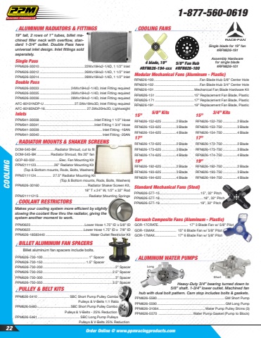 Order Online @ www.ppmracingproducts.comCOOLING1-877-560-061922ALUMINUM WATER PUMPS LongHeavy-Duty 3/4%u201d bearing turned down to5/8%u201d shaft. 1-3/4%u201d lower outlet. Machined fanhub with dual bolt pattern. Cam stop includes bolts & gaskets.PPM626-5580 ........................................................................ GM Short PumpPPM626-5590 .........................................................................GM Long PumpPPM626-31064 .................................................Water Pump Pulley Shims (3)PPM626-5570 ....................................Water Pump Gasket (Pump to Block)ShortBILLET ALUMINUM FAN SPACERSPPM626-730-100 ................................................ 1%u201d SpacerPPM626-730-150 ............................................. 1.5%u201d SpacerPPM626-730-200 ............................................................................2%u201d SpacerPPM626-730-250 .........................................................................2.5%u201d SpacerPPM626-730-300 ............................................................................3%u201d SpacerPPM626-750-350 .........................................................................3.5%u201d SpacerBillet aluminum fan spacers include bolts.COOLANT RESTRICTORSPPM0623 .........................................................Lower Hose 1.75%u201d ID x 5/8%u201d IDPPM0622 ........................................................Lower Hose 1.75%u201d ID x 7/8%u201d IDPPM626-18583440 ...............................................Water Outlet Restrictor Kit Makes your cooling system more efficient by slightly slowing the coolant flow thru the radiator, giving the system another moment to work.ALUMINUM RADIATORS & FITTINGS19%u201d tall, 2 rows of 1%u201d tubes, billet machined filler neck with overflow, standard 1-3/4%u201d outlet. Double Pass have universal inlet design. Inlet fittings sold seperately.Single PassPPM626-30010 ................................................22Wx19Hx2-1/4D, 1 1/2%u201d InletPPM626-30012 ................................................26Wx19Hx2-1/4D, 1 1/2%u201d InletPPM626-30014 ................................................28Wx19Hx2-1/4D, 1 1/2%u201d InletDouble PassPPM626-30033 ................................. 24Wx19Hx2-1/4D, Inlet Fitting requiredPPM626-30035 ................................. 26Wx19Hx2-1/4D, Inlet Fitting requiredPPM626-30036 ................................. 28Wx19Hx2-1/4D, Inlet Fitting requiredAFC-80101NDP-U ................................ 27.5Wx19Hx3D, Inlet Fitting requiredAFC-80185NDP-16 ............................................ 27.5Wx20Hx2D, LightweightInletsPPM941-30038 ...........................................................Inlet Fitting 1 1/2%u201d Hose PPM941-30041 ...........................................................Inlet Fitting 1 3/4%u201d HosePPM941-30039 ................................................................... Inlet Fitting -16ANPPM941-30040 ................................................................... Inlet Fitting -20ANRADIATOR MOUNTS & SHAKER SCREENSDOM-540-BK ...................Radiator Shroud, cut to fitDOM-545-BK ..............Radiator Shroud, fits 20%u201d fanQCP-60-032 .........................Elec. Fan Mounting KitPPM2111123 ...................26%u201d Radiator Mounting Kit(Top & Bottom mounts, Rods, Bolts, Washers)PPM2111124 ................ 27.5%u201d Radiator Mounting Kit(Top & Bottom mounts, Rods, Bolts, Washers)PPM626-30160 ..................................................Radiator Shaker Screen Kit, 18%u201d T x 24%u201d W, 1/2%u201d x 32%u201d RodPPM2111121S .................................................... Radiator Mounting SpringsPULLEY & BELT KITSPPM626-5410 .................................SBC Short Pump Pulley ComboPulleys & V-Belts 1:1 RatioPPM626-5460 ......................................SBC Short Pump Pulley ComboPulleys & V-Belts - 25% ReductionPPM626-5461 ............................................ SBC Long Pump PulleysPulleys & V-Belts 25% Reduction4 blade, 19%u201d#RFN626-194-xxxStandard Mechanical Fans (Steel)PPM626-577-15 ...........................................15%u201d, 32%u00b0 PitchPPM626-577-18 ..............................................18%u201d, 32%u00b0 PitchPPM626-577-19 .......................................... 19%u201d, 32%u00b0 PitchGorsuch Composite Fans (Aluminum - Plastic)GOR-17CRATE ............................... 17%u201d 3 Blade Fan w/ 5/8%u201d PilotGOR-15MAX ....................... 15%u201d 6 Blade Fan w/ 5/8%u201d PilotGOR-17MAX ....................... 17%u201d 6 Blade Fan w/ 5/8%u201d PilotSingle blade for 19%u201d fan#RFN626-191Assembly Hardwarefor single blade#RFN626-1015/8%u201d Fan Hub#RFN626-100COOLING FANS15%u201dRFN626-152-625 ................2 BladeRFN626-153-625 ................3 BladeRFN626-154-625 ................4 Blade17%u201dRFN626-172-625 ................2 BladeRFN626-173-625 ................3 BladeRFN626-174-625 ................4 Blade19%u201dRFN626-192-625 ................2 BladeRFN626-193-625 ................3 BladeRFN626-194-625 ................4 Blade5/8%u201d Kits 15%u201dRFN626-152-750 ................2 BladeRFN626-153-750 ................3 BladeRFN626-154-750 ................4 Blade17%u201dRFN626-172-750 ................2 BladeRFN626-173-750 ................3 BladeRFN626-174-750 ................4 Blade19%u201dRFN626-192-750 ................2 BladeRFN626-193-750 ................3 BladeRFN626-194-750 ................4 Blade3/4%u201d KitsModular Mechanical Fans (Aluminum - Plastic)RFN626-100 ................................................Fan Blade Hub 5/8%u201d Center HoleRFN626-102 ................................................Fan Blade Hub 3/4%u201d Center HoleRFN626-101 ..........................................Mechanical Fan Blade Hardware KitRFM626-151 .........................................15%u201d Replacement Fan Blade, PlasticRFM626-171 .........................................17%u201d Replacement Fan B