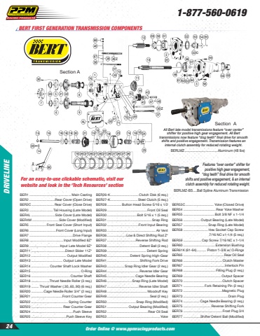 Order Online @ www.ppmracingproducts.comDRIVELINE1-877-560-061924BER26-K .............................. Clutch Disk (6 req.)BER27-K .............................Steel Clutch (5 req.)BER28 ...............Button Head Screw 5/16 x 1/2BER29 ..........................................Front Oil SealBER30 ...............................Bolt 5/16 x 1 (5 req.)BER31 ...............................................Snap RingBER32 .................................Front Input BearingBER33 ................................................... Air VentBER36 ....................Low & Direct Shifting Rod Z*BER37 ..............................Reverse Shifting RodBER38 ..................................Detent Ball (3 req.)BER39 ......................................... Detent SpringBER40 ........................Detent Spring High-GearBER41 ..................................Shifting Fork DriveBER43 ..................Snap Ring Idler Gear (2 req.)BER44 ..................................Reverse Idler GearBER45 ............................. Cage Needle BearingBER46 ..........................Snap Ring (Late Model)BER47 .................................Reverse Idler ShaftBER48 ..........................................Woodruff KeyBER49 .............................................Seal (2 req.)BER50 ..............................Snap Ring (Modified)BER51 ...................... Output Bearing (Modified)BER52 ...........................................Rear Oil SealBER53 ........................................................YokeBER53C .............................. Yoke (Closed Drive)BER54 .................................. Rear Yoke WasherBER55 .................................Bolt 3/8 NF x 1-1/4BER56 .................. Output Bearing (Late Model)BER57 ..........................Snap Ring (Late Model)BER58 .......................... Hex Socket Cap Screw 7/16 NC x1-1/4 (5 req.)BER59 ...................Cap Screw 7/16 NC x 1-1/4BER60 ..................................Extension BushingBER61K (61-64) .......... Piston 1-3/8 w/ O-RingsBER65 ...........................................Rear Oil SealBER66 .........................................Clutch MasterBER67 ............................................Interlock PinBER68 ..................................Filling Plug (2 req.)BER69 ........................................Output SpacerBER70 .........................................Clutch SpacerBER71 ...................... Fork Retaining Pin (2 req.)BER72 .........................................Magnetic PlugBER73 ...............................................Drain PlugBER74 ................. Cage Needle Bearing (2 req.)BER75 ............................. Reverse Shifting ForkBER76 .........................................Frost Plug 3/4BER77 ..................Shifter Detent Ball (Modified)BER1 ............................................ Main CastingBER2 ...........................Rear Cover (Open Drive)BER2C ........................ Rear Cover (Close Drive)BER3 ......................... Tail Housing (Late Model)BER4L .........................Side Cover (Late Model)BER4M ............................Side Cover (Modified)BER5 ..................Front Seal Cover (Short Input)BER6 ............................Front Cover (Long Input)BER7 ..............................................Drive FlangeBER8 ....................................Input Modified 8Z*BER9 ................................Input Late Model 9Z*BER11 ....................................Direct Slider 11Z*BER12 ..................................... Output ModifiedBER13 ................................. Output Late ModelBER14 ................... Counter Shaft Lock WasherBER15 .................................................... O-RingBER16 ......................................... Counter ShaftBER18 ...................Thrust Needle Roller (3 req.)BER19 ........ Thrust Washer (.30,.60,.90) (6 req.)BER20 .............Cage Needle Roller 3/4%u201d (2 req.)BER21 .................................Front Counter GearBER22 ....................................... Spring CounterBER23 ................................. Rear Counter GearBER24 ............................................Push SleeveBER25 .....................................Push Sleeve KeyBERT FIRST GENERATION TRANSMISSION COMPONENTSFor an easy-to-use clickable schematic, visit our website and look in the %u2018Tech Resources%u2019 sectionBERLMZ-BS ....Ball Spline Aluminum TransmissionFeatures %u201cover center%u201d shifter for positive high gear engagement, %u201cdog teeth%u201d final drive for smooth shifts and positive engagement, & an internal clutch assembly for reduced rotating weight.Section ABERLMZ ...................................Aluminum (48 lbs)All Bert late model transmissions feature %u201cover center%u201d shifter for positive high gear engagement. All Bert transmissions now feature %u201cdog teeth%u201d final drive for smooth shifts and positive engagement. Transmission features an internal clutch assembly for reduced rotating weight. Section A