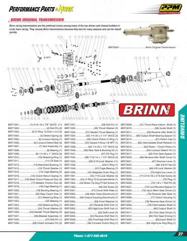 Phone: 1-877-560-0619DRIVELINE27BRI70001 .......................................Brinn Original TransmissionBrinn racing transmissions are the preferred choice among many of the top drivers and chassis builders in circle track racing. They choose Brinn transmissions because they last for many seasons and can be rebuilt quickly.BRINN ORIGINAL TRANSMISSIONBRI71001................(1) 5/16-18 x 7/8%u201d SHCS (11)BRI71002.........................................(2) Roll Pin (2)BRI71003.................. (3) O-Ring 10.5mm x 3.0 (4)BRI71004...............................(4) Detent Spring (3)BRI71005............................ (5) Lockout Spring (1)BRI71006..................... (6) Lockout Detent Ball (5)BRI71007............................. (7) Vent Assembly (1)BRI71008.........................................(8) Bearing (1)BRI71009........................ (9) 1/4-20 x 1%u201d SHCS (6)BRI71010........................... (10) Retaining Ring (1) BRI71011.......................................(11) Oil Seal (1)BRI71012.....................(12) Machined Bushing (1)BRI71013............................(13) Thrust Washer (1)BRI71015.............................(14) Cage Bearing (2)BRI71016................. (15) Clutch Return Spring (1)BRI71017........ (16) Steel Clutch Pressure Disc (5)BRI71018................. (17) Metallic Friction Disc (6)BRI71019.............................(18) Cage Bearing (1)BRI71020......................... (19) Bunting Bearing (1)BRI71021........................(20) Rear Clutch Disk (1)BRI71022........................... (21) Retaining Ring (1)BRI71023.......................................(22) Bearing (1)BRI71024........................... (23) Retaining Ring (1)BRI71025............................(24) Thrust Washer (2)BRI71026...............(25) Needle Thrust Bearing (2)BRI71027......................(26) Bleeder Assembly (1)BRI71029.......................................(27) Roll Pin (1)BRI71030....................(28) Clutch Actuator Pin (3)BRI71031...................................... (29) Roll Pin (1)BRI71032........................... (30) Thrust Washer (2)BRI71033.............. (31) Needle Thrust Bearing (1)BRI71034............... (32) 1/4-20 x 2 1/4%u201d SHCS (3)BRI71035................ (33) Clutch Piston O-Ring (1)BRI71036..............(34) Grease Fitting 1/8 NPT (1)BRI71038.................. (35) 1/4-20 x 1/2%u201d SHCS (2)BRI71040............ (36) Rear Seal & Bushing Kit (1)BRI71041......................................(37) Fill Plug (1)BRI71042............. (38) 7/16-14 x 1 1/2%u201d SHCS (4)BRI71043................... (39) 5/16 Lock Washer (11)BRI71046.......................................(40) O-Ring (1)BRI71049............................ (41) Cage Bearing (1)BRI71059..................(42) Magnetic Drain Plug (1)BRI71061..................... (43) 7/16 Lock Washer (3)BRI71063.......(44) O-Ring 70 Duromete Nitrile (1)BRI71064......(45) Brass Tip Dog Pt Set Screw (1)BRI71065..................................(46) Set Screw (2)BRI72001....................... (47) Cover Shift Plate (1)BRI72002.............. (48) Main Case (Aluminum) (1)BRI72003......(49) Output Housing (Aluminum) (1)BRI72004............................(50) Front Retainer (1)BRI73001.....................(51) Reverse Shift Fork (1)BRI73002.................. (52) High/Low Shift Fork (1)BRI73003................................. (53) Shift Lever (2)BRI73005..................... (54) Reverse Shift Rod (1)BRI73006...................(55) First/High Shift Rod (1)BRI73007................. (56) Forward Clutch Ring (1)BRI73009........... (57) Thrust Race Interm. Shaft (1)BRI73010................................. (58) Guide Shaft (1)BRI73011......................(59) Reverse Idler Shaft (1)BRI73012......(60) Output Shaft Bearing Spacer (1)BRI73013...................................(61) Piston Cap (1)BRI73014........ (62) Intermediate Shaft Retainer (1)BRI73015................. (63) Piston - Clutch Piston (1)BRI73016......................(64) Lockout Detent Pin (1)BRI73017........................ (65) First Gear Spacer (1)BRI73020........... (66) Reverse Idler Shaft Cover (1)BRI73021..............................(67) Reverse Lever (1)BRI73022................................... (68) 3/8-24 Nut (2)BRI73023......................... (69) 3/8 Lock Washer (2)BRI73024........................... (70) High/Low Lever (1)BRI73025........... (71) 5/16-18 x 5/16 Set Screw (3)BRI73026............................................. (72) Plug (1)BRI73029............................ (73) 1/8 x 1 Roll Pin (2)BRI73031...................(74) Low/Reverse Spacer (1)BRI74002.............. (75) Input Mesh Gear Driven (1)BRI74004.......................(76) Reverse Idler Gear (1)BRI74006............................(77) Clutch Housing (1)BRI74007................... (78) Reverse Gear Driven (1)BRI74008.......................(79) Intermediate Shaft (1)BRI74010................................(80) Output Shaft (1)BRI74011......................... (81) First Gear Driven (1)BRI74012........................ (82) First Gear Driving (1)BRI74020...................................(83) Input Shaft (1)BRI74021.....................(84) High/Low Dog Ring (1)