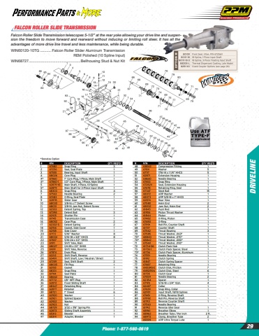 Phone: 1-877-560-0619DRIVELINE29WIN60120-10TG %ufffd%ufffd%ufffd%ufffd%ufffd%ufffd%ufffd%ufffd%ufffd%ufffd%ufffd Falcon Roller Slider Aluminum Transmission REM Polished (10 Spline Input)WIN68727 ..................................................Bellhousing Stud & Nut Kit Falcon Roller Slide Transmission telescopes 5-1/2%u201d at the rear yoke allowing your drive line and suspension the freedom to move forward and rearward without inducing or limiting roll steer. It has all the advantages of more drive line travel and less maintenance, while being durable.FALCON ROLLER SLIDE TRANSMISSION
