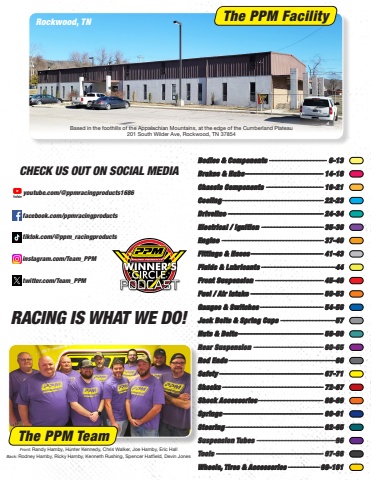 twitter.com/Team_PPMyoutube.com/@ppmracingproducts1686instagram.com/Team_PPMtiktok.com/@ppm_racingproductsfacebook.com/ppmracingproductsCHECK US OUT ON SOCIAL MEDIARACING IS WHAT WE DO!Front: Randy Hamby, Hunter Kennedy, Chris Walker, Joe Hamby, Eric Hall Back: Rodney Hamby, Ricky Hamby, Kenneth Rushing, Spencer Hatfield, Devin JonesThe PPM TeamThe PPM Facility Rockwood, TNBased in the foothills of the Appalachian Mountains, at the edge of the Cumberland Plateau201 South Wilder Ave, Rockwood, TN 37854Bodies & Components __________________ 6-13Brakes & Hubs_________________________ 14-18Chassis Components __________________ 19-21Cooling ________________________________ 22-23Driveline _______________________________ 24-34Electrical / Ignition ____________________ 35-36Engine _________________________________ 37-40Fittings & Hoses _______________________ 41-43Fluids & Lubricants _______________________44Front Suspension ______________________ 45-49Fuel / Air Intake _______________________ 50-53Gauges & Switches ____________________ 54-56Jack Bolts & Spring Cups _________________57Nuts & Bolts ___________________________ 58-59Rear Suspension ______________________ 60-65Rod Ends __________________________________66Safety _________________________________ 67-71Shocks ________________________________ 72-87Shock Accessories ____________________ 88-89Springs _______________________________ 90-91Steering _______________________________ 92-95Suspension Tubes _________________________96Tools __________________________________ 97-98Wheels, Tires & Accessories __________99-101
