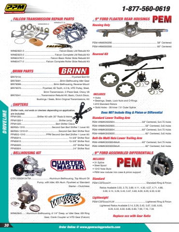Order Online @ www.ppmracingproducts.comDRIVELINE1-877-560-061930WIN62822-2 .................................................... Falcon Basic LM Rebuild KitWIN62823-2 ............................................. Falcon Complete LM Rebuild KitWIN63476-2 ....................................... Falcon Basic Roller Slide Rebuild KitWIN63477-2 ................................ Falcon Complete Roller Slide Rebuild KitWIN62823-2PEM-HNM290290 ................................................................... 58%u201d CenteredPEM-HNM300300 ................................................................... 60%u201d CenteredHousing OnlyQTR120509134TM ........................... Aluminum Bellhousing, Top Mount Oil Pump, with Idler, 65t Alum. Flywheel w/ Standard Starter %u2013 ClutchlessFALCON TRANSMISSION REPAIR PARTS 9%u201d FORD FLOATER REAR HOUSINGSBELLHOUSING KITBRINN PARTSBRI79134 ..............................................................................Flywheel Bolt KitBRI79091 ............................................................Brinn Bellhousing Idler GearBRI79099 ..................................................Brinn Bellhousing, Reverse MountBRI79070 .................................Flywheel, 65 Tooth, 4.3 lb, HTD Pulley, Steel, Brinn Transmission, 2-Piece Seal, Chevy V8BRI70041 ...............................Transmission Rebuild Kit, Basic, Clutch Discs, Bushings / Seals, Brinn Original Transmissions, KitSHIFTERSShifter rods, rod ends or clevises depending on application, are included.PPM1000 .........................Shifter Kit with 20\PPM1000-1 ......................................................Shifter (only) PPM1020 .....................................................Bert Shifter ClevisBERSG-1310 .........................................Second Gen Bert Shifter 1 Lever KitBERSG-1310-01 ...............................................Second Gen Bert Shifter RodPPMSG-1310 ............................... PPM Second Gen Bert Shifter 1 Lever KitPPM3814......................................................................... 14-3/8%u201d Shifter RodPPM3815......................................................................... 15-3/8%u201d Shifter RodPPM3820................................................................................20%u201d Shifter RodPPM3824................................................................................24%u201d Shifter RodWIN63477-2Standard Lower Trailing ArmPEM-HNMK2902904 .........................................58%u201d Centered, 5x4.75 HubsPEM-HNMK2902905 ..............................................58%u201d Centered, 5x5 HubsPEM-HNMK3003004 .........................................60%u201d Centered, 5x4.75 HubsPEM-HNMK3003005 ..............................................60%u201d Centered, 5x5 HubsBolt-On Multi Hole Lower Trailing ArmPEM-HNMK3003004Multi .................................60%u201d Centered, 5x4.75 HubsPEM-HNMK3003005Multi ......................................60%u201d Centered, 5x5 HubsINCLUDES%u2022 Hubs%u2022 Bearings, Seals, Lock Nuts and O-Rings%u2022.810 Standard Rotors%u2022 Solid Axles - 28 Inner / 31 Outer SplineRearend KitDoes NOT Include Ring & Pinion or Differential9%u201d FORD ASSEMBLED DIFFERENTIALSStandardPEM-CSFSxxx31 ..................................................... Standard Ring & PinionLightweightPEM-CSFSxxx31LW .............................................. Lightened Ring & PinionReplace xxx with Gear RatioINCLUDES%u2022 31 Spline%u2022 Steel Spool%u2022 1310 Yoke Style%u2022 PEM new nodular iron case & pinion supportRatios Available 3.50, 3.70, 3.89, 4.11, 4.30, 4,57, 4.71, 4.86, 5.00, 5.14, 5.29, 5.43, 5.67, 5.83, 6.00, 6.20, 6.33, 6.50Lightened Ratios Available 5.14, 5.29, 5.43, 5.67, 5.83, 6.00, 6.20, 6.33, 6.50. 6.66, 6.83, 7.00, 7.16, 7.33WIN62843 .......Aluminum Bellhousing, 6 1/4%u201d Deep, w/ Idler Gear, 63t Ring Gear, Crank Coupler w/ HTD Gear (Falcon)