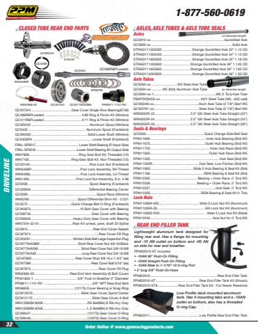 Order Online @ www.ppmracingproducts.comDRIVELINE1-877-560-061932CLOSED TUBE REAR END PARTSQCW7524KT0450WIN6498RQCW7524 ...........................................Gear Cover Single Row Bearing(6746)QC486R&PLoaded ........................................4:86 Ring & Pinion Kit (Winters)QC411R&PLoaded ........................................4:11 Ring & Pinion Kit (Winters)QCW0432 ..............................................................Aluminum Spool (Winters)QC0432 ............................................................. Aluminum Spool (Frankland)QCW0400 ............................................................Solid Lower Shaft (Winters)QC0405PH ............................................................... Lower Shaft (Frankland)FRKL-SP0017 ................................................... Lower Shaft Bearing (Ft Input Side)FRKL-SP0018 .................................................Lower Shaft Bearing (Rr Output SideWIN7868 .....................................................Ring Gear Bolt Kit, Threaded (12)WIN7165 .............................................Ring Gear Bolt Kit, Non-Threaded (12)QC0214A ...............................................................Posi-Lock Nut (Frankland)WIN6498R ...................................................Posi Lock Assembly, RH ThreadWIN6498L .....................................................Posi Lock Assembly, LH ThreadWIN1493 ..................................................Posi Lock Nut Assembly, 8 in. 4.86QC0290 .................................................................Spool Bearing (Frankland)QC0290W ............................................................. Differential Bearing CarrierQC0280 .........................................................................Spool Race (Winters)WIN5295 ................................................... Spool Differential Shim Kit - 2.031QC0275 ..............................................Quick Change Bell O-Ring (Frankland)QCW4873 ....................................................10 Bolt Gear Cover with BearingQCW6746 ................................................................ Gear Cover with BearingQCW6630 .............................................Heavy Duty Gear Cover with BearingWIN7204-32-01 ...................................Rear Kit w/seal, yoke, shaft 32 SplineQC0815 .....................................................................Rear End Cover GasketQCW7874 ........................................................................Rear Cover Fill PlugQCW3261 ............................................ Winters Side Bell Large Inspection PlugQCW7794ASBK ........................................Short Rear Cover Nut 3/8-16 BlackQCW7794ASM ............................................. Short Rear Cover Nut 3/8-16 MillQCW7794AM ................................................Long Rear Cover Nut 3/8-16 MillQCW7802 ..............................................Rear Cover Stud 3/8-16 x 1-3/4%u201d (ea)QCW7398 ................................................................Rear Cover Ball 5/16%u201d (ea)QCW7874 ........................................................................Rear Cover Fill PlugWIN2966-02 .....................................Rear End Vent Assembly (6 Bolt Cover)PPM1850-1 ............................................. 3/8%u201d Push In Breather 2%u201d DiameterPPM911-1741-RV ...................................................3/8%u201d NPT Rear End VentWIN8659................................................ (12175) Cover Bearing w Snap Ring QCW12070................................................... Billet Gear Cover, Sprint CenterQCW12175 ............................................................... Billet Gear Cover, 6 BoltWIN12083M-8208 ...............................................RS Bell(Blk) 8 Rib Hvy DutyWIN12080M-8208 .............................................. L S Bell(Blk) 8 Rib Hvy DutyQCW8447............................................................(12175) Gear Cover O-RingQCW8446............................................................(12070) Gear Cover O-RingQCW0432QC486R&PLoadedQC0280WIN5295QCW7794ASBKQC0400WIN2966-02AxlesQC0910-xx ..............................................................................Gundrilled Axle QC0900-xx ......................................................................................Solid AxleSTRAGY11303300 ............................... Strange Gundrilled Axle 33%u201d 1.13 ODSTRAGY11303400 ............................... Strange Gundrilled Axle 34%u201d 1.13 ODSTRAGY11803500 ............................... Strange Gundrilled Axle 35%u201d 1.18 ODSTRAGY11453600 ............................. Strange Gundrilled Axle 36%u201d 1.145 ODSTRAGY11653600 ............................. Strange Gundrilled Axle 36%u201d 1.165 ODSTRAGY12003600 ............................... Strange Gundrilled Axle 36%u201d 1.20 ODAxle TubesQC0263-xx ............................W5 Steel Axle Tube QC0264-xx ............W5 (Std) Aluminum Axle TubeQC0264-xx-1 ..................................................................W5 (1 Ton) Axle Tube PEMTWSW5S-xx ...........................................HVY Steel Tube (W5, .625 wall)QCW3246-xx................................................Alum Axle Tube (2 7/8%u201d) Bert W5QCW3791-xx................................................Steel Axle Tube (2 7/8%u201d) Bert W5WIN5052R-22..................................... 2.5%u201d GN Steel Axle Tube Straight (22%u201d)WIN5052R-24..................................... 2.5%u201d GN Steel Axle Tube Straight (24%u201d) WIN5052R-26..................................... 2.5%u201d GN Steel Axle Tube Straight (26%u201d)Seals & BearingsQC0300 ............................................................. Quick Change Side Bell SealPPM11690 ........................................................... Inner Hub Bearing (Std) W5PPM11670 .......................................................... Outer Hub Bearing (Std) W5PPM11720 ...
