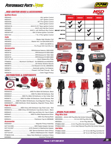 Phone: 1-877-560-0619ELECTRICAL / IGNITION35MSD IGNITION BOXES & ACCESSORIESMSD6425MSD8250Ignition BoxesMSD6425 .........................................................................6AL Ignition ControlMSD6427 ........................................................................ 6CT Ignition ControlMSD6428 ..................................................................6CT Pro Ignition ControlMSD6430 ......................................................................6ALN Ignition ControlMSD64316 ...............................................6ALN D.I.R.T Spec Ignition ControlMSD6631 ........................................................... 6HVC with Fast Rev ControlMSD6632 ...............................................6HVC-L with SoftTouch Rev ControlMSD6014CT................................................GM LS Series Ignition ControllerMSD7222 ............................................................ 7 AL-2 Plus Ignition ControlCoilsMSD8222 .............................................................. Blaster High Vibration CoilMSD8252 .................................................. Blaster HVC Coil (6ALN/6AL/6CT)MSD8250 ........................................................................ 6HVC Coil (6HVC-L)MSD8251 ......................................................... Pro Power HVC Coil (7AL-2+)AccessoriesMSD8672..................................................RPM Module Selector, 6000-8200MSD8746 ...........................................................RPM Module Kit 6000-6800MSD8747 ...........................................................RPM Module Kit 7000-7800MSD8748 ............................................................RPM Module Kit 8000-8800QCP-50-442 ............................................................Quick Release Box PlatePPM8250 .....................Aluminum Coil Mount - fits MSD8250 and MSD8252MSD8823 ............................................................5/6-Series Vibration MountsMSD8213 ...................................................Coil Bracket 2.25 Dia. (MSD8222)MSD8210 ......................................................Automatic Ignition Coil SelectorMSD8211 ...................................................Firewall Coil Feed Through - RedMSD8276.......................................................................Crank Trigger PickupMSD6632PPM8250MSD8433MSD8467MSD85555QCP-50-2006DistributorsMSD85555 ..............................................MSD Pro-Billet V8 Distributor, BlackMSD85551 ................................................MSD Pro-Billet V8 Distributor, RedMSD85561 ......................... MSD Pro-Billet V8 Distributor w/ Adj. Collar, RedMSD8570 ........................MSD Pro-Billet V8 Distributor, Small Diameter, RedMSD8356.............MSD Pro-Billet V8 Distributor, Dual Magnetic Pickup, RedMSD8362CT......MSD Distributor, Stock Appearing, Magnetic Pickup, BlackCaps & RotorsMSD8433 ........................MSD Chevy HEI Distributor Cap (Twist Lock) - RedMSD84313 ................ MSD Chevy HEI Distributor Cap (Screw Down) - BlackMSD8445 ............................................MSD Cap and Rotor Kit, Cap-A-DaptsMSD8467 .................................................MSD Pro-Billet Replacement RotorMSD8470 ...................................................................MSD 4Cyl Racing Rotor MSD8434 .......................................................... Distributor Cap for MSD8485 AccessoriesMSD84661 ........................................................... Magnetic Pickup AssemblyQCP-50-2006 ...................................................MSD Digital Adapter HarnessQCP-50-2007 ......................................6-Pin Deutsch to Weatherstrip AdapterMSD8471 ........................................... .500%u201d Bronze Distributor Gear (Chevy}QCP-50-207 ............................................MSD to Weatherpack Dist. AdapterPPM828-9126 ............................... Heavy Duty Distributor Lockdown ClampMSD8992 ......................................................................Inductive Timing LightQCP-50-207MSD8222MSD 6ALRECOMMENDED COILSMSD 6ALNMSD 6CT / 6CT ProMSD HVCMSD 7AL-2MSD8252 MSD8250 MSD8251MSD6430MSD6428MSD7222MSD8252MSD8471MSD8570MSD8356 MSD8362CTMSD8672DISTRIBUTORS & COMPONENTSPlug Wire SetsMSD35591 ... 8.5mm HEI Plug Wire Set (Under Exhaust)MSD35593 ............................. 8.5 mm HEI Plug Wire SetMSD5554 ..............................................8 mm Plug Wire SetPPM846-0350 ................8 mm Plug Wire Set (Under Exhaust)PPM846-0355 ................8 mm Heat Sleeved Plug Wire Set (Under Exhaust)Coil WirePPM865-03500 ............................................24%u201d 8 mm HEI Plug Coil Wire KitPPM865-03600 ............................................36%u201d 8 mm HEI Plug Coil Wire KitSPARK PLUG WIRES