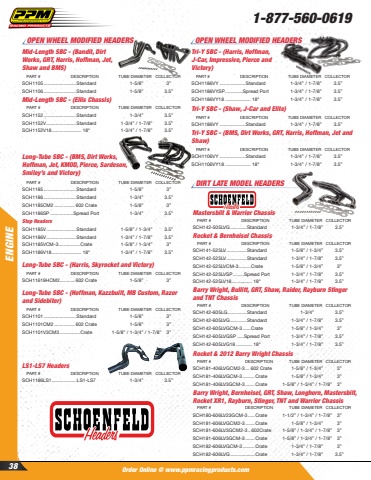 Order Online @ www.ppmracingproducts.comENGINE1-877-560-061938DIRT LATE MODEL HEADERSOPEN WHEEL MODIFIED HEADERS OPEN WHEEL MODIFIED HEADERSSCH142-505LVG............Standard 1-3/4%u201d / 1-7/8%u201d 3.5%u201d PART # DESCRIPTION TUBE DIAMETER COLLECTORMastersbilt & Warrior ChassisSCH141-525LV...............Standard 1-5/8%u201d / 1-3/4%u201d 3.5%u201d SCH142-525LV...............Standard 1-3/4%u201d / 1-7/8%u201d 3.5%u201d SCH142-525LVCM-3.........Crate 1-5/8%u201d / 1-3/4%u201d 3%u201dSCH142-525LVSP........Spread Port 1-3/4%u201d / 1-7/8%u201d 3.5%u201dSCH142-525LV18............... 18%u00b0 1-3/4%u201d / 1-7/8%u201d 3.5%u201dPART # DESCRIPTION TUBE DIAMETER COLLECTORRocket & Bernheisel ChassisSCH142-605LG..............Standard 1-3/4%u201d 3.5%u201d SCH142-605LVG............Standard 1-3/4%u201d / 1-7/8%u201d 3.5%u201d SCH142-605LVGCM-3......Crate 1-5/8%u201d / 1-3/4%u201d 3%u201dSCH142-605LVGSP .....Spread Port 1-3/4%u201d / 1-7/8%u201d 3.5%u201dSCH142-605LVG18............ 18%u00b0 1-3/4%u201d / 1-7/8%u201d 3.5%u201dPART # DESCRIPTION TUBE DIAMETER COLLECTORBarry Wright, Bullitt, GRT, Shaw, Raider, Rayburn Stinger and TNT ChassisSCH181-406LVGCM2-3... 602 Crate 1-5/8%u201d / 1-3/4%u201d 3%u201d SCH181-406LVGCM-3.........Crate 1-5/8%u201d / 1-3/4%u201d 3%u201d SCH181-406LV3GCM-3.......Crate 1-5/8%u201d / 1-3/4%u201d / 1-7/8%u201d 3%u201dPART # DESCRIPTION TUBE DIAMETER COLLECTORRocket & 2012 Barry Wright ChassisSCH180-606LV23GCM-3.....Crate 1-1/2%u201d / 1-3/4%u201d / 1-7/8%u201d 3%u201d SCH181-606LVGCM2-3.......Crate 1-5/8%u201d / 1-3/4%u201d 3%u201d SCH181-606LV3GCM2-3..602Crate 1-5/8%u201d / 1-3/4%u201d / 1-7/8%u201d 3%u201d SCH181-606LV3GCM-3.......Crate 1-5/8%u201d / 1-3/4%u201d / 1-7/8%u201d 3%u201dSCH182-606LVGCM-3.........Crate 1-3/4%u201d / 1-7/8%u201d 3%u201dSCH182-606LVG..................Crate 1-3/4%u201d / 1-7/8%u201d 3.5%u201dPART # DESCRIPTION TUBE DIAMETER COLLECTORBarry Wright, Bernheisel, GRT, Shaw, Longhorn, Mastersbilt, Rocket XR1, Rayburn, Stinger, TNT and Warrior ChassisSCH1105........................Standard 1-5/8%u201d 3%u201d SCH1106........................Standard 1-5/8%u201d 3.5%u201d PART # DESCRIPTION TUBE DIAMETER COLLECTORMid-Length SBC - (Bandit, Dirt Works, GRT, Harris, Hoffman, Jet, Shaw and BMS)SCH1101........................Standard 1-5/8%u201d 3%u201dSCH1101CM2 ............... 602 Crate 1-5/8%u201d 3%u201d SCH1101V3CM3 ...............Crate 1-5/8%u201d / 1-3/4%u201d / 1-7/8%u201d 3%u201d PART # DESCRIPTION TUBE DIAMETER COLLECTORLong-Tube SBC - (Hoffman, Kazzbuilt, MB Custom, Razor and Sidebiter)SCH1152........................Standard 1-3/4%u201d 3.5%u201d SCH1152V......................Standard 1-3/4%u201d / 1-7/8%u201d 3.5%u201dSCH1152V18...................... 18%u00b0 1-3/4%u201d / 1-7/8%u201d 3.5%u201dPART # DESCRIPTION TUBE DIAMETER COLLECTORMid-Length SBC - (Ellis Chassis)SCH1185........................Standard 1-5/8%u201d 3%u201dSCH1186........................Standard 1-3/4%u201d 3.5%u201dSCH1185CM2 ............... 602 Crate 1-5/8%u201d 3%u201d SCH1186SP .................Spread Port 1-3/4%u201d 3.5%u201d Step HeadersSCH1185V......................Standard 1-5/8%u201d / 1-3/4%u201d 3.5%u201dSCH1186V......................Standard 1-3/4%u201d / 1-7/8%u201d 3.5%u201dSCH1185VCM-3................Crate 1-5/8%u201d / 1-3/4%u201d 3%u201d SCH1186V18...................... 18%u00b0 1-3/4%u201d / 1-7/8%u201d 3.5%u201d PART # DESCRIPTION TUBE DIAMETER COLLECTORLong-Tube SBC - (BMS, Dirt Works, Hoffman, Jet, KMOD, Pierce, Sardeson, Smiley%u2019s and Victory)SCH11619HCM2........... 602 Crate 1-5/8%u201d 3%u201dPART # DESCRIPTION TUBE DIAMETER COLLECTORLong-Tube SBC - (Harris, Skyrocket and Victory)SCH1186LS1.................. LS1-LS7 1-3/4%u201d 3.5%u201dPART # DESCRIPTION TUBE DIAMETER COLLECTORLS1-LS7 HeadersSCH1186VY ...................Standard 1-3/4%u201d / 1-7/8%u201d 3.5%u201d SCH1186VYSP.............Spread Port 1-3/4%u201d / 1-7/8%u201d 3.5%u201dSCH1186VY18 ................... 18%u00b0 1-3/4%u201d / 1-7/8%u201d 3.5%u201d PART # DESCRIPTION TUBE DIAMETER COLLECTORTri-Y SBC - (Harris, Hoffman, J-Car, Impressive, Pierce and Victory)SCH1186VY ...................Standard 1-3/4%u201d / 1-7/8%u201d 3.5%u201d PART # DESCRIPTION TUBE DIAMETER COLLECTORTri-Y SBC - (Shaw, J-Car and Elite)SCH1106VY ...................Standard 1-3/4%u201d / 1-7/8%u201d 3.5%u201d SCH1106VY18 ................... 18%u00b0 1-3/4%u201d / 1-7/8%u201d 3.5%u201d PART # DESCRIPTION TUBE DIAMETER COLLECTORTri-Y SBC - (BMS, Dirt Works, GRT, Harris, Hoffman, Jet and Shaw)