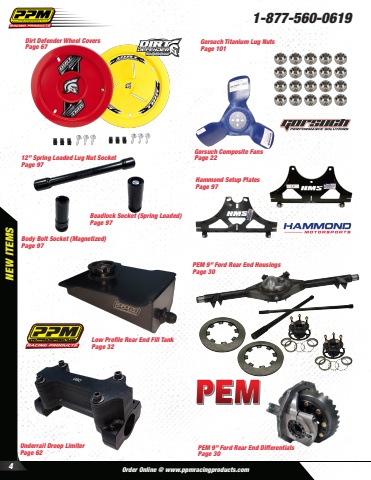 NEW ITEMS1-877-560-0619Order Online @ www.ppmracingproducts.com 4Underrail Droop LimiterPage 62Gorsuch Composite FansPage 22Hammond Setup PlatesPage 97PEM 9%u201d Ford Rear End HousingsPage 30Dirt Defender Wheel CoversPage 67Body Bolt Socket (Magnetized)Page 97Beadlock Socket (Spring Loaded)Page 9712%u201d Spring Loaded Lug Nut SocketPage 97Low Profile Rear End Fill TankPage 32PEM 9%u201d Ford Rear End DifferentialsPage 30Gorsuch Titanium Lug NutsPage 101