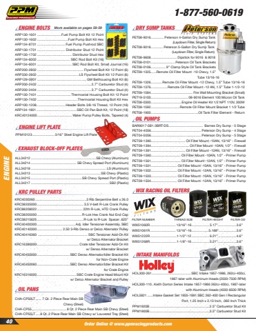 Order Online @ www.ppmracingproducts.comENGINE1-877-560-061940EXHAUST BLOCK-OFF PLATESENGINE BOLTS DRY SUMP TANKSPET08-9016 .............. Peterson 4-Gallon Dry Sump Tank (Laydown Filter, Single Return)PET08-9018 ............. Peterson 5-Gallon Dry Sump Tank (Laydown Filter, Single Return)PET08-9608 ............................ Dipstick for 9016 & 9018PET08-0101 ..........................Peterson Oil Tank BracketsPET08-0106 ................ 9%u201d Clamp Style Oil Tank BracketsPET09-1325 ......Remote Oil Filter Mount -10 Chevy, 1.5%u201d Tube 13/16-16PET09-1326 ............Remote Oil Filter Mount -12 Chevy, 1.5%u201d Tube 13/16-16PET09-1376 ..................Remote Oil Filter Mount -12 AN, 1.5%u201d Tube 1-1/2-12PET09-1584 ............................................. Fire Wall Mounting Bracket (Small)PET19-5100 ........................................ 08-9016 Element 100 Micron Oil TankPET08-0300 .................................Engine Oil Heater Kit 1/2 NPT 110V, 300WPET09-1592 ...............................Remote Oil Filter Mount Bracket 1 1/2 TubePET08-1900...................................................Oil Tank Filter Element - ReturnKRC4030260 .......................................................3 Rib Serpentine Belt x 26.0KRC38335000 .................................................. 3.5 V-belt R-Lok Crank PulleyKRC88208022 ................................................. 22th R-Lok, HTD Crank PulleyKRC38205000 ................................................R-Lok Hex Crank Nut End CapKRC38215625 ..................................................R-Lok to R-Lok Spacer .625%u201dKRC40400300 .........................................Adj. Idler Tensioner Assembly, SBCKRC40140300 ........................... 2.50 3-Rib Denso or Delco Alternator PulleyKRC40416360 ..................................................... SBC Tensioner Add-On Kitw/ Delco Alternator BracketKRC16390000 ............................................. Crate Idler Tensioner Add-On Kitw/ Denso Alternator BracketKRC40450000 ...................................SBC Denso Alternator/Idler Bracket Kit for Non-Crate EngineKRC40450060 ...................................SBC Denso Alternator/Idler Bracket Kit for Crate EngineKRC16316000 ..........................................SBC Crate Engine Head Mount Kit w/ Delco Alternator Bracket and Pulley WIX RACING OIL FILTERSFILTER NUMBER THREAD SIZE FILTER HEIGHT FILTER ODWIX51060R............................ 13/16%u201d-16...................5.17%u201d....................3.6%u201dWIX51061R............................ 13/16%u201d-16..................5.188%u201d...................3.6%u201dWIX51222R.............................1-1/2%u201d-12...................6.21%u201d....................4.6%u201dWIX51268R.............................1-1/8%u201d-16...................5.21%u201d....................3.6%u201dARP130-1601 .........................Fuel Pump Bolt Kit 12 PointARP130-1602 ................................Fuel Pump Bolt Kit HexARP134-8701 ............................. Fuel Pump Pushrod SBCARP130-1701 ............................. Distributor Stud 12 PointARP130-1702 .................................... Distributor Stud HexARP134-6002 .................................. SBC Rod Bolt Kit (16)ARP134-6001 ....................................SBC Rod Bolt Kit, Small Journal (16)ARP200-2802 ................................................ Flywheel Bolt Kit 12 Point (6)ARP330-2802 ........................................... LS Flywheel Bolt Kit 12 Point (6)ARP129-0901 ................................................... GM Bellhousing Bolt Kit (6)ARP200-2402 ........................................................2.7%u201d Carburetor Stud (4)ARP200-2404 ........................................................3.7%u201d Carburetor Stud (4)ARP130-7401 ...................................Thermostat Housing Bolt Kit 12 Point ARP130-7402 ..........................................Thermostat Housing Bolt Kit HexARP100-1208 ...............................Header Bolts 3/8-16 Thread, 12 Point (16)ARP134-1801...........................................SBC Oil Pan Bolt Kit, 12 Point (18)KRC40124000 ..................................... Water Pump Pulley Bolts, Tapered (4)ALL34212 ......................................................................SB Chevy (Aluminum)ALL34214 ................................................. SB Chevy Spread Port (Aluminum)ALL34218 ................................................................................. LS (Aluminum)ALL34213 ...........................................................................SB Chevy (Plastic)ALL34215 .......................................................SB Chevy Spread Port (Plastic)ALL34217 .................................................................................... SB2 (Plastic)ENGINE LIFT PLATEPPM10123 ........................ 3/16%u201d Steel Engine Lift PlateKRC PULLEY PARTSINTAKE MANIFOLDSHOL300-261..........................................SBC Intake 1957-1986, 262ci-400ci, 1987-later with Aluminum Heads (2500-7500 RPM)HOL300-110 ..Keith Dorton Series Intake 1957-1986 262ci-400ci, 1987-later with Aluminum Heads (4500-8500 RPM)HOL5821 ......Intake Gasket Set 1955-1991 SBC 262-400 Gen I Rectangular Port, 1.25 Inch x 2.13 Inch, .060 Inch ThickPPM1920B ................................................................2.5%u201d Carburetor Stud KitPPM1900B ................................................................3.5%u201d Carburetor Stud KitOIL PANSCHA-CP50LT ...... 7 Qt. 2 Piece Rear Main SB Chevy (Steel)CHA-CP55 ..................................... 8 Qt. 2 Piece Rear Main SB Chevy (Steel)CHA-CP55LT .....8 Qt. 2 Piece Rear Main SB Chevy w/ Louvered Tray (Steel)OIL PUMPSBAR9017-5B1.0BRT-DS ..................................... Barnes Dry Sump - 5 StagePET04-4056 ...................................................... Peterson Dry Sump - 4 StagePET04-5056 ...................................................... Peterson D