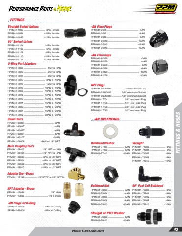Phone: 1-877-560-0619FITTINGS & HOSES43-AN Flare CapsPPM941-60329 ................................................. -3ANPPM941-60429 ................................................. -4ANPPM941-60629 ................................................. -6ANPPM941-60829 ................................................. -8ANPPM941-61029 ............................................... -10ANPPM941-61229 ............................................... -12ANPPM941-7025 .................................. -4AN to -4ANPPM941-7022 .................................. -6AN to -8ANPPM941-7014 .................................. -8AN to -8ANPPM941-7017 ................................ -8AN to -10ANPPM941-7015 ................................ -10AN to -8ANPPM941-7016 .............................. -10AN to -10ANPPM941-7005 ............................. -10AN to -12ANPPM941-7018 .............................. -12AN to -10ANPPM941-7019 .............................. -16AN to -12ANPPM941-7011 .............................. -16AN to -16ANPPM941-7020 .............................. -10AN to -20ANPPM941-7021 .............................. -16AN to -20ANPPM941-7012 .............................. -20AN to -20ANO-Ring Port AdaptersNPT PlugsPPM941-03543041 ................... 1/2%u201d Aluminum HexPPM941-03543042 .............. 3/8%u201d Aluminum Socket PPM941-03543043 .............. 1/2%u201d Aluminum SocketPPM941-17704 .........................1/8%u201d Hex Head PlugPPM941-17706 .........................1/4%u201d Hex Head PlugPPM941-17708 .........................3/8%u201d Hex Head PlugPPM941-17710 .........................1/2%u201d Hex Head PlugUnion Tee%u2019sPPM941-8003T .............................................-3ANPPM941-8004T .............................................-4ANPPM941-8006T .............................................-6ANPPM941-8008T .............................................-8ANPPM941-8010T ...........................................-10ANPPM941-28608 ........................-8AN w/ 1/8%u201d NPTMale Coupling Tee%u2019sPPM941-28403 ...........................1/8%u201d NPT to -3ANPPM941-28404 ...........................1/8%u201d NPT to -4ANPPM941-28503 ...........................-3AN to 1/8%u201d NPTPPM941-28504 ...........................-4AN to 1/8%u201d NPTPPM941-28508 ...........................-8AN to 3/8%u201d NPTPPM941-28510 .........................-10AN to 1/2%u201d NPT-AN Flare PlugsPPM941-2044 ................................................ -4ANPPM941-2046 ................................................ -6ANPPM941-2048 ................................................ -8ANPPM941-20410 ............................................ -10ANPPM941-20412 ............................................ -12ANPPM941-20416 ............................................ -16ANAdapter Tee - BrassPPM941-17138 ...................1/8%u201dNPT F to 1/8%u201d NPT MNPT Adapter - BrassPPM941-17884 ....................................... 1/8%u201d Male PPM941-17885 ................................... 1/8%u201d Female-AN Plugs w/ O-RingPPM941-29606 .............................-6AN w/ O-RingPPM941-29608 .............................-8AN w/ O-RingBulkhead WasherPPM941-77006 ........................-6ANPPM941-77008 ........................-8ANPPM941-77010 ......................-10ANStraightPPM941-71003 ........................-3ANPPM941-71004 ........................-4ANPPM941-71006 ........................-6ANPPM941-71008 ........................-8ANPPM941-71010 ......................-10AN90%u00b0 Fuel Cell BulkheadPPM941-79903 ........................-3ANPPM941-79904 ........................-4ANPPM941-79906 ........................-6ANPPM941-79908 ........................-8ANPPM941-79910 ......................-10ANBulkhead NutPPM941-78003 ........................-3ANPPM941-78004 ........................-4ANPPM941-78006 ........................-6ANPPM941-78008 ........................-8ANPPM941-78010 ......................-10ANStraight w/ PTFE WasherPPM941-76008 ........................-8ANPPM941-76010 ......................-10ANStraight Swivel UnionsPPM941-1093 ................................ -8AN Female PPM941-1094 .............................. -10AN FemalePPM941-1095 .............................. -12AN Female90%u00b0 Swivel UnionsPPM941-1104 ................................ -4AN Female PPM941-1106 ................................ -6AN FemalePPM941-1108 ................................ -8AN FemalePPM941-1110 .............................. -10AN FemalePPM941-1112 .............................. -12AN FemaleFITTINGS-AN BULKHEADS