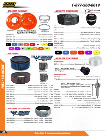 Order Online @ www.ppmracingproducts.comFUEL / AIR INTAKE1-877-560-061950WAL3000817 ..................................Walker Performance Air Filter 3%u201dx 14%u201ddiaWAL3000204 ..................................Walker Performance Air Filter 4%u201dx 14%u201ddiaWAL3000775 ..................................Walker Performance Air Filter 5%u201dx 14%u201ddiaPPM1850-3 .....................................................Washable Air Filter 3%u201dx 14%u201ddiaPPM1850-4 .....................................................Washable Air Filter 4%u201dx 14%u201ddiaPPM1850-5 .....................................................Washable Air Filter 5%u201dx 14%u201ddiaPPM1850-138 .........................................................Shielded Breather 1-3/8%u201dPPM1850-112 .........................................................Shielded Breather 1-1/2%u201dKRC79525000 .................................................. CT525 Vent Breather SystemPPM1850-138PPM1850-112AIR FILTERSAIR FILTER HOUSINGSPPM1831xx ........................................................... 14%u201d Flat Breather HousingPPM1840-050 ......................................................... 1/2%u201d Air Cleaner AdapterPPM1840-100 .............................................................1%u201d Air Cleaner AdapterPPM1840-200 .............................................................2%u201d Air Cleaner AdapterPPM1831FOPPM1840-050PPM1840-100Breather Housings Include Top, Bottom & 1/2%u201d Adapter3%u201dOTW-10-1141xx ............................................ Air Cleaner Pre-Filter, 3%u201d No Top 4%u201dOTW-10-1002xx ............................................ Air Cleaner Pre-Filter, 4%u201d No Top OTW-10-1014xx .......................................... Air Cleaner Pre-Filter, 4%u201d with Top5%u201dOTW-10-1004xx ............................................ Air Cleaner Pre-Filter, 5%u201d No Top OTW-10-1020xx .......................................... Air Cleaner Pre-Filter, 5%u201d with Top CrankcaseOTW-10-1013xx ..................................................Crankcase Pre-Filter, No Top OTW-10-1018xx .................................. Shielded Crankcase Pre-Filter, No TopAIR FILTER OUTERWEARSAIR FILTER OUTERWEARSWAL3000792..........................Air Cleaner Pre-Filter, 3%u201d No Top - White WalkerWAL3000790..........................Air Cleaner Pre-Filter, 4%u201d No Top - White WalkerWAL3000791..........................Air Cleaner Pre-Filter, 5%u201d No Top - White WalkerAIR FILTER ACCESSORIESBILLET AIR FILTER KNOBBlack anodized aluminum, knurled top & O-Ring seal.Carb CoversQCP-64-146 ................Aluminum Carb Cover w/ O-RingBreather KnobsPPM1800 .........................................Billet Aluminum Breather Knob 5/16%u201d-18PPM1820 ................................................... Aluminum Breather Knob 1/4%u201d-20StudsPPM1880-0 ....... 1 3/4%u201d Billet Air Filter Stud 5/16%u201d-18 ThreadPPM1880-1 ..............3%u201d Billet Air Filter Stud 5/16%u201d-18 Thread PPM1880-2 .........3-1/2%u201d Billet Air Filter Stud 5/16-18 ThreadPPM1880-3 ........................... 4%u201d Billet Air Filter Stud 5/16%u201d-18 ThreadPPM1880-4 ...................................... 7%u201d Billet Air Filter Stud 5/16%u201d-18 ThreadHOL6399 ...................................................................1/4-20 Air Cleaner StudLON52-32750 ...................................7%u201d Adj. Air Cleaner Stud 5/16%u201d-18 ThreadPPM1888 ................................8%u201d Chromoly Air Cleaner Stud 5/16%u201d-18 ThreadBILLET AIR FILTER STUDAvailable in 5 lengths. Tightens filter assembly better without overtighten and breaking stud. Seals out dirt.