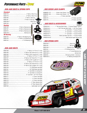 Phone: 1-877-560-0619JACK BOLTS & SPRING CUPS57BSB SPRING CUPSJACK BOLTS & ACCESSORIESBSB JACK BOLTS & SPRING CUPS BSB SCREW JACK CLAMPSStandardBSB7478 ........................................................4%u201d Bolt w/ Short CupBSB7479 ........................................................6%u201d Bolt w/ Short CupBSB7480 .....................................................4%u201d Bolt w/ Tall CupBSB7481 ...................................................6%u201d Bolt w/ Tall CupBSB7350-7..................................................................Short CupBSB7449 ..........................................................................Tall CupBearingBSB7456 ................................ 4%u201d Bolt w/ Bearing CupBSB7457 ................................ 6%u201d Bolt w/ Bearing CupBSB7672 ................................ 8%u201d Bolt w/ Bearing CupBSB7448-1.............................................. Bearing CupOD BearingBSB7442 ...........................4%u201d Bolt w/ OD Bearing CupBSB7443 ................................6%u201d Bolt w/ OD Bearing CupBSB7444 ............................................5%u201d OD Bearing CupBSB7479BSB7457BSB7443PPM20194-1 ............... 1%u201d Tall Jack Bolt Collar - 1%u201d Course ThreadPPM20194-2 .......................1 3/8%u201d Tall Jack Bolt Collar - 1 1/8%u201d Fine ThreadPPM20194-6 ............................................... 6%u201d Jack Bolt - 1%u201d Course ThreadPPM20194-8 ............................................... 8%u201d Jack Bolt - 1%u201d Course ThreadPPM20194-11 ........................................... 11%u201d Jack Bolt - 1%u201d Course ThreadPPM20194-N ............................Steel Jack Bolt Jam Nut - 1%u201d Course ThreadPPM20194-SC ..............................................Steel Swivel Upper Spring CupBSB8055-175 ..................Screw Jack Clamp 1 3/4%u201dBSB8055-150 ..................Screw Jack Clamp 1 1/2%u201dBSB7471 .......................................4%u201d Clevis Jack Bolt BSB7472 ......................................................................... 6%u201d Clevis Jack Bolt BSB7473 ......................................................................... 8%u201d Clevis Jack Bolt BSB7350-7.................................................................Short CupBSB7449 ...................................................................Tall CupBSB7448-1.........................................................Bearing CupBSB7444 ....................................................5%u201d OD Bearing CupBSB7448-2................................................................2%u201d Lower Bearing CupBSB7446-3.................................................................................Spring CupBSB7545 ..................................................... OD Spring Holder - AluminumBSB7545-3........................................................ 5%u201d Bearing and Spacer KitBSB7449BSB7468 ...........................................................4%u201d Bolt w/ 1/2%u201d Pin 5.7%u201d LongBSB7466 ................................................. 4%u201d Bolt w/ 5/8%u201d Short Pin 5.7%u201d LongBSB7465 ..................................................4%u201d Bolt w/ 5/8%u201d Long Pin 6.7%u201d LongBSB7469 ...........................................................6%u201d Bolt w/ 1/2%u201d Pin 7.7%u201d LongBSB7467 ................................................. 6%u201d Bolt w/ 5/8%u201d Short Pin 7.7%u201d LongBSB7459 ...................................................6%u201d Bolt w/ 5/8%u201d LongPin 8.7%u201d LongBSB7482 ...........................................................8%u201d Bolt w/ 1/2%u201d Pin 9.7%u201d LongBSB7483 ................................................. 8%u201d Bolt w/ 5/8%u201d Short Pin 9.7%u201d LongBSB7484 .................................................8%u201d Bolt w/ 5/8%u201d LongPin 10.7%u201d LongBSB7458 .................................................................. 7.5%u201d Bull Nose Jack BoltBSB7461 .................................................................. 9.5%u201d Bull Nose Jack BoltBSB7454 ............................................................. 4%u201d Jack Bolt w/ Locking PinBSB7453 ............................................................. 6%u201d Jack Bolt w/ Locking PinBSB7460 ........................................................6%u201d Jack Bolt - 3/4%u201d Fine ThreadBSB7471 ........................................................................... 4%u201d Clevis Jack BoltBSB7472 ........................................................................... 6%u201d Clevis Jack BoltBSB7473 ........................................................................... 8%u201d Clevis Jack BoltBSB7476 ........................................................................4%u201d Rear Adjuster BoltBSB7477 ........................................................................6%u201d Rear Adjuster BoltBSB7452 ........................................................................ Lightweight Jam NutBSB JACK BOLTS