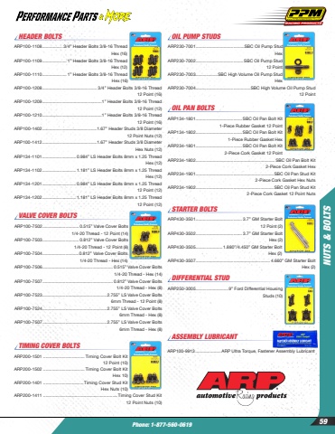 Phone: 1-877-560-0619NUTS & BOLTS59DIFFERENTIAL STUDSTARTER BOLTSOIL PAN BOLTSOIL PUMP STUDSTIMING COVER BOLTSVALVE COVER BOLTSHEADER BOLTSARP100-1108 ................. 3/4%u201d Header Bolts 3/8-16 Thread Hex (16)ARP100-1109 .................... 1%u201d Header Bolts 3/8-16 Thread Hex (12)ARP100-1110 .................... 1%u201d Header Bolts 3/8-16 Thread Hex (16)ARP100-1208 ............................................. 3/4%u201d Header Bolts 3/8-16 Thread 12 Point (16)ARP100-1209 .................................................1%u201d Header Bolts 3/8-16 Thread 12 Point (12)ARP100-1210 .................................................1%u201d Header Bolts 3/8-16 Thread 12 Point (16)ARP100-1402 .............................................1.67%u201d Header Studs 3/8 Diameter12 Point Nuts (12)ARP100-1412 .............................................1.67%u201d Header Studs 3/8 DiameterHex Nuts (12)ARP134-1101 ............................0.984%u201d LS Header Bolts 8mm x 1.25 ThreadHex (12)ARP134-1102 ............................1.181%u201d LS Header Bolts 8mm x 1.25 ThreadHex (12)ARP134-1201 ............................0.984%u201d LS Header Bolts 8mm x 1.25 Thread12 Point (12)ARP134-1202 ............................1.181%u201d LS Header Bolts 8mm x 1.25 Thread12 Point (12)ARP100-7502 .............................. 0.515%u201d Valve Cover Bolts 1/4-20 Thread - 12 Point (14)ARP100-7503 .............................. 0.812%u201d Valve Cover Bolts 1/4-20 Thread - 12 Point (8)ARP100-7504 ..............................0.812%u201d Valve Cover Bolts 1/4-20 Thread - Hex (14)ARP100-7506 .......................................................... 0.515%u201d Valve Cover Bolts 1/4-20 Thread - Hex (14)ARP100-7507 .......................................................... 0.812%u201d Valve Cover Bolts 1/4-20 Thread - Hex (8)ARP100-7523 .....................................................2.755%u201d LS Valve Cover Bolts 6mm Thread - 12 Point (8)ARP100-7524 .....................................................2.755%u201d LS Valve Cover Bolts 6mm Thread - Hex (8)ARP100-7507 .....................................................2.755%u201d LS Valve Cover Bolts 6mm Thread - Hex (8)ARP200-1501 ................................. Timing Cover Bolt Kit 12 Point (10)ARP200-1502 ................................. Timing Cover Bolt Kit Hex 10)ARP200-1401 ................................ Timing Cover Stud Kit Hex Nuts (10)ARP200-1411 ...........................................................Timing Cover Stud Kit 12 Point Nuts (10)ARP230-7001 ........................................SBC Oil Pump StudHexARP230-7002 .......................................SBC Oil Pump Stud12 PointARP230-7003 ..................SBC High Volume Oil Pump StudHexARP230-7004 .............................................SBC High Volume Oil Pump Stud12 PointARP134-1801 ...................................... SBC Oil Pan Bolt Kit1-Piece Rubber Gasket 12 PointARP134-1802 ...................................... SBC Oil Pan Bolt Kit1-Piece Rubber Gasket HexARP234-1801 ...................................... SBC Oil Pan Bolt Kit2-Piece Cork Gasket 12 PointARP234-1802 ................................................................. SBC Oil Pan Bolt Kit2-Piece Cork Gasket HexARP234-1901 ................................................................SBC Oil Pan Stud Kit2-Piece Cork Gasket Hex NutsARP234-1902 ................................................................SBC Oil Pan Stud Kit2-Piece Cork Gasket 12 Point NutsARP430-3501 ...................................... 3.7%u201d GM Starter Bolt 12 Point (2)ARP430-3502 ...................................... 3.7%u201d GM Starter Bolt Hex (2)ARP430-3505 ...................... 1.880%u201d/4.450%u201d GM Starter Bolt Hex (2)ARP430-3507 ............................................................. 4.660%u201d GM Starter Bolt Hex (2)ARP250-3005 ...........................9%u201d Ford Differential Housing Studs (10)ARP100-9913 ..................... ARP Ultra Torque, Fastener Assembly LubricantASSEMBLY LUBRICANT