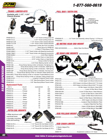Order Online @ www.ppmracingproducts.comREAR SUSPENSION1-877-560-061962QC METRIC REAR END MOUNTPULL BAR / SIXTH COILFIFTH COIL MOUNTSTRAVEL LIMITER KITSPPM0120-R14 ...................................... 1-1/4%u201d Round 5th Coil Slider (2.25%u201dL)PPM0120-R .......................................... 1-1/2%u201d Round 5th Coil Slider (2.25%u201dL)PPM0130-R ........................................... 1-1/2%u201d Round 5th Coil Slider (3.75%u201dL)PPM0120-R PPM0120-S PPM0130-R%u2022 Billet aluminum with machined boss.%u2022 Includes mounting bolts and bushing.PPM0260-R ................2.5%u201d Sixth Coil Assembly without Spring 1-1/2 RoundPPM0200C ......................................................................... Clevis (Aluminum)PPM0260-R2-1/2%u201d coil over spring(not included)will accept 4%u201d springPPM0156-2PPM0150-LC .................................................1-1/2%u201d Travel Limiting Chain KitPPM0175-LC .................................................1-3/4%u201d Travel Limiting Chain KitPPM0150-LCB .................................... 1-1/2%u201d Travel Limiter Chassis BracketPPM0175-LCB .................................... 1-3/4%u201d Travel Limiter Chassis BracketPPM0140 ...........................................Suspension Limiter (No Puck Included) PPM0140C .............................................................Steel Clevis for PPM0140PPM4015HD ..................................................... 2-Piece 3%u201d Ring (Heavy Duty)PPM0150BLC .........................1-1/2%u201d Travel Limiter with Bearing Housing KitPPM0175BLC .........................1-3/4%u201d Travel Limiter with Bearing Housing KitPPM0185ADJ ................................................................. Limit Chain AdjusterPPM0141 ................................................. 3/16%u201d Limiter Chain w/ Heat ShrinkPPM0142 ................................................. 5/16%u201d Limiter Chain w/ Heat ShrinkPPM0149-S .............................................................. Droop Limiter for SpringPPM0146 ................................................Limit Chain Bearing Carrier w/chainPPM0149S .............Droop Bump Spring Limiter w/indicator, No Spring Incl.PPM01495 .................. Droop Bump Spring Limiter w/indicator, 500# SpringPPM01497 .................. Droop Bump Spring Limiter w/indicator, 700# SpringPPM0149P .............. Droop Bump Spring Limiter w/ Indicator, No Puck Incl.PPM149G .......... Droop Bump Spring Limiter w/ Indicator Green (Soft) PuckPPM149PU . Droop Bump Spring Limiter w/ Indicator Purple (Medium) PuckPPM0149Y ...... Droop Bump Spring Limiter w/ Indicator Yellow (Hard) PuckPPM0143-25 ..............................................Longhorn Underrail Travel LimiterPPM0156-2 .........................................1.25%u201d Rear Bump Block Travel LimiterPPM0156-5 .........................................1.50%u201d Rear Bump Block Travel LimiterReplacement PucksPPM0150-LCAvailable with 1-1/2%u201d, 1-3/4%u201d Chassis BracketPPM0149PPM0140PPM1430S-WPPM1001BBPPM1001TBPPM1400............................................. 3 Hole Upper Link Mount (Aluminum)PPM1410............................................. 2 Hole Upper Link Mount (Aluminum)PPM1420 .............................. 9010 Upper Link Mount (Short) (3/4%u201d T/A Hole)PPM1425 .............................. 9010 Upper Link Mount (Short) (5/8%u201d T/A Hole)PPM1425X......................................... Lift Bar Upper Link Mount, Steel (XR1)PPM1430S-R ........................................................Lower Lift Bar Mount SteelPPM1430-SW ........................................ Lower Lift Bar Mount, Steel (Warrior)PPM1430S-X............................................. Lower Lift Bar Mount, Steel (XR1)PPM1450 ....................................................Upper Lift Bar Mount (Aluminum)PPM1455 .............................................. Upper Lift Bar Mount, Steel (Warrior)PPM1460 ..................................................... 9010 Upper Link Mount (4 Hole)PPM1001BB .............................................. Longhorn Rear End Bottom PlatePPM1001TB .................................................... Longhorn Rear End Top PlatePPM1480 .................................................... Upper Lift Bar Mount, Steel GRTPPM1485 .................................................... Lower Lift Bar Mount, Steel GRTPPM1460PPM1450PPM1420PPM1430SRPPM1455BSB PULLBAR MOUNTBSB3090 ..................................Quick Change PullBar MountPEM-QCC0232WK ..................Metric Rear End MountPPM30129........................ Green 50 .625PPM30130....................... Orange 55 .625PPM30131........................Purple 60 .625PPM30121.........................Black 65 .625PPM30128........................Yellow 75 .625PPM30125........................ Green 50 .500PPM30126....................... Orange 55 .500 PPM30127........................Purple 60 .500 PPM30134.........................Black 65 .500 PPM30133........................Yellow 75 .500PART # COLOR DUROMETER IDQC REAR LINK MOUNTSBSB CHAIN LIMITERBSB3170 .......................................Suspension Limiter w/ 12%u201d Chain%u2022 Quick Adjust Pin%u2022 SteelSold Individually