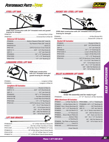 Phone: 1-877-560-0619REAR SUSPENSION63LONGHORN STEEL LIFT BAR PPM8900 .................................................................................... Longhorn Lift BarPPM8900K.............................................................................Longhorn Lift Bar KitDOM steel construction with 3/4%u201d threaded ends and gusset bracing for strength.Longhorn Kit Includes:PPM8900................................................................Rocket Lift Bar (1)CMR10-12..................................................(5/8%u201d - 3/4%u201d) Rod Ends (2)JNR-12 ................................................................... 3/4%u201d Jam Nuts (2)PPM58500.................................................... 5/8%u201d x 1/2%u201d Bushings (2)PPM1001BB....................................................Top Rear End Plate (2)PPM1001TB ................................................Lower Rear End Plate (2)PPM12500...................................................... 1/2%u201d x 1/2%u201d Bushing (1)PPM1440......................................... 5/8%u201dID Aluminum Cross Tube (2)1/2%u201d - 13 x 2%u201d Hex Screw (1)1/2%u201d - 13 Full Nylon Nut (1)5/8%u201d - 18 x 8%u201d Hex Bolt (2)5/8%u201d - SAE Flat Washers (4)5/8%u201d - 18 Full Nylon Nut (2)LIFT BAR BRACES PPM8526-K ..................................................10%u201d Lift Bar Side Mount Brace KitPPM4017 ..................................................Dbl Tab Lift Bar Axle Mount ClampPPM1225R ......................................25%u201d Lift Bar Tube for PPM8500 (1/2%u201d ends)PPM8525-K ........................................ 25%u201d Lift Bar Brace Tube Kit (Axle Mount)PPM12275R ................................................... 27 1/2%u201d Lift Bar Tube (1/2%u201d ends)PPM8527-K ........................................ 27%u201d Lift Bar Brace Tube Kit (Axle Mount)ROCKET XR1 STEEL LIFT BARPPM8400 ...............................................................................Lift Bar (Rocket XR1)PPM 8400K........................................................................Rocket XR1 Lift Bar KitRocket Kit Includes:PPM8400................................................................Rocket Lift Bar (1)CMR10-12..................................................(5/8%u201d - 3/4%u201d) Rod Ends (2)JNR-12 ................................................................... 3/4%u201d Jam Nuts (2)PPM58500.................................................... 5/8%u201d x 1/2%u201d Bushings (2)PPM1430S-X................................................Lower Lift Bar Mount (2)PPM1425X....................................................Upper Lift Bar Mount (2)PPM12500...................................................... 1/2%u201d x 1/2%u201d Bushing (2)PPM1440........................................ 5/8%u201d ID Aluminum Cross Tube (2)1/2%u201d - 13 x 2 3/4%u201d Hex Screw (1)1/2%u201d - 13 Full Nylon Nut (1)5/8%u201d - 18 x 7 1/2%u201d Hex Bolt (2)5/8%u201d - SAE Flat Washers (4)5/8%u201d - 18 Full Nylon Nut (2)DOM steel construction with 3/4%u201d threaded ends and gusset bracing for strength. PPM8700 ...........................................................................Universal Short Lift Bar PPM8700K ...................................................................Universal Short Lift Bar KitUniversal Kit Includes:PPM8508...................................Bottom Rearend Plate (5/8%u201d hole) (2)PPM8509.........................................Top Rearend Plate (5/8%u201d hole) (2)PPM2042CW........................................................................Clevis (1)PPM1440......................................... 5/8%u201dID Aluminum Cross Tube (2)CMR10-12..................................................(5/8%u201d - 3/4%u201d) Rod Ends (2)JNR-12 ................................................................... 3/4%u201d Jam Nuts (2)PPM58500.................................................... 5/8%u201d x 1/2%u201d Bushings (2)PPM12500...................................................... 1/2%u201d x 1/2%u201d Bushing (2)PPM12750...................................................... 1/2%u201d x 3/4%u201d Bushing (1)DOM steel construction with 3/4%u201d threaded ends and gusset bracing for strength.STEEL LIFT BARPPM8500PPM8500K ...........................................31%u201d-37%u201d Aluminum Lift Bar AssemblyOrder the assembly and be ready to go!Billet Aluminum Kit Includes:PPM8501............Lift Bar Top Bar (1)PPM8502......Lift Bar Bottom Bar (1)PPM8507 Alum. Shock Bushings (2)PPM8506... 3/4%u201d x 1/2%u201d Bushings (3)PPM8505 .............6th Coil Mount (1)PPM8504 ..................1/4%u201d Braces (2)PPM8503.... Shock Mount Plates (2) PPM8509 .....................Bottom Plate w/ Bushing (2)PPM8508...Top Plate w/ Bushing (2) PPM2042CW .....................Clevis (1)PPM1440 .............. 5/8%u201dID Aluminum Cross Tube (2)PPM12999A ....1/2%u201d x 1%u201d Bushing (2)PPM58500..5/8%u201d x 1/2%u201d Bushings (2)CMR10 ................ 5/8%u201d Rod Ends (2)JNR-10 .................5/8%u201d Jam Nuts (2)3/8%u201d - 16 x 2%u201d Button Head Bolts (14)3/8%u201d - SAE Flat Washers (14)3/8%u201d - Nylon Jam Nut (14)5/8%u201d - 18 x 7 1/2%u201d Hex Bolt (2)5/8%u201d - SAE Flat Washers (2)5/8%u201d - 18 Full Nylon Nut (2)BILLET ALUMINUM LIFT BARS