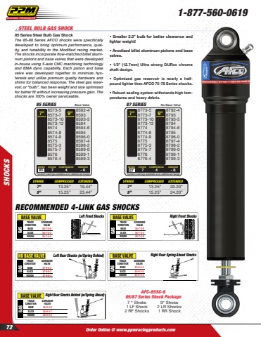 Order Online @ www.ppmracingproducts.comSHOCKS1-877-560-061972STEEL BULB GAS SHOCKRECOMMENDED 4-LINK GAS SHOCKS GASTRACK SCHRADERCONDITION VALVEBASE 87-9-8-2SLICK 87-9-9-2ROUGH 87-9-6-3NO BASE VALVE Left Rear Shocks (w/Spring Behind)GASTRACK SCHRADERCONDITION VALVEBASE 85-9-3-4SLICK 85-9-3-5ROUGH 85-9-4-4BASE VALVE Right Rear Spring Ahead ShocksGASTRACK SCHRADERCONDITION VALVEBASE 85-7-4-6SLICK 85-7-5-3ROUGH 85-7-4-4BASE VALVE Left Front ShocksGASTRACK SCHRADERCONDITION VALVEBASE 85-7-3-8SLICK 85-7-3-5ROUGH 85-7-4-6Right Front Shocks BASE VALVEGASTRACK SCHRADERCONDITION VALVEBASE 85-9-4-6SLICK 85-9-3-7ROUGH 85-9-5-5BASE VALV Right Rear Shocks Behind (w/Spring Ahead) E85 Series Steel Bulb Gas Shock The 85-88 Series AFCO shocks were specifically developed to bring optimum performance, quality, and tunability to the Modified racing market. The shocks incorporate flow-matched billet aluminum pistons and base valves that were developed in-house using 5-axis CNC machining technology and EMA dyno capability. Each piston and base valve was developed together to minimize hysteresis and utilize premium quality hardware and shims for balanced response. The steel gas reservoir, or %u201cbulb%u201d, has been weight and size optimizedfor better fit without increasing pressure gain. The shocks are 100% owner serviceable.%u2022 Smaller 2.5%u201d bulb for better clearance and lighter weight!%u2022 Anodized billet aluminum pistons and base valves.%u2022 1/2%u201d (12.7mm) Ultra strong DURox chrome shaft design.%u2022 Optimized gas reservoir is nearly a halfpound lighter than AFCO 75-78 Series shocks.%u2022 Robust sealing system withstands high temperatures and heavy debris.8573-58573-78573-108573-1285748574-88574-985758575-38575-785768576-48592-48593 8593-585948594-6 8595 8596-08597-4 8598-28599-08599-18599-37%u201dSTROKE9%u201dSTROKESERIES STROKE COMPRESSION REBOUND85 7 4 - 685 SERIES*Custom valvings available at an additional chargeBase Valve8773-58773-78773-108773-1287748774-88774-987758775-38775-787768776-48792-48793 8793-587948794-6 8795 8796-08797-4 8798-28799-08799-18799-37%u201dSTROKE9%u201dSTROKESERIES STROKE COMPRESSION REBOUND87 7 4 - 887 SERIES*Custom valvings available at an additional chargeNo Base ValveSTROKE COMPRESSED EXTENDED7%u201d 13.25%u201d 19.44%u201d9%u201d 15.25%u201d 23.44%u201d7%u201dCOMPRESSED EXTENDED13.25%u201d 20.20%u201dSTROKE9%u201d 15.25%u201d 24.20%u201d85/87 Series Shock Package7 %u201c Stroke1 LF Shock2 RF Shocks9%u201c Stroke2 LR Shocks1 RR ShockAFC-85SC-6