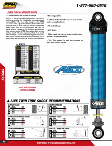 Order Online @ www.ppmracingproducts.comSHOCKS1-877-560-061974TWIN TUBE ALUMINUM SHOCK13 Series Twin Tube Aluminum Shock AFCO 13 Series Shocks feature shim stack technology, providing the very best in consistency and repeatability. The twin tube design of the AFCO 13 Series Non-Adjustable Shocks delivers the best performance on both slick and smooth racetracks. Make your ride more comfortable and get the edge when it comes to car handling and suspension performance. AFCO Racing twin tube shocks deliver a soft ride and superb control, all at an affordable cost. These shocks are a great fit for your late model oval track race car and will allow you to get a good feel for the track, be it dirt or pavement.%u2022 Non-Adjustable%u2022 2.13%u201d outside diameter for coil-over or noncoil-over applications.%u2022 Threaded Body.%u2022 5/8%u201d Shaft.%u2022 Shim stack technology gives excellent consistency and repeatability.%u2022 Twin Tube design for best performance on slick and smooth tracks.CALL FOR AVAILABLESHOCK PACKAGES4-LINK TWIN TUBE SHOCK RECOMMENDATIONSLeft Rear Behind ShocksLeft Front ShocksLeft Rear Front / Traction ShocksRight Front ShocksRight Rear ShocksFifth Coil / Torque Arm ShocksTWIN TUBETWIN TUBETWIN TUBE TWIN TUBE TWIN TUBE TWIN TUBETRACKCONDITIONNON ADJ.BASE 1375-7SLICK 1376-4ROUGH 1374-7TRACKCONDITIONNON ADJ.BASE 1373-8SLICK 1373-8ROUGH 1374-8TRACKCONDITIONNON ADJ.BASE 1396-0SLICK 1398-0ROUGH 1396-3TRACKCONDITIONNON ADJ.BASE 1394SLICK 1393-6ROUGH 1393-6TRACKCONDITIONNON ADJ.BASE 1394SLICK 1395-3ROUGH 1394-5TRACKCONDITIONNON ADJ.BASE 1373-5SLICK 1373-7ROUGH 13731373-51373-71373-101373-1213741374-81374-913751375-31375-713761376-41392-41393 1393-513941394-6 1395 1396-01397-4 1398-21399-01399-11399-37%u201dSTROKE9%u201dSTROKESERIES STROKE COMPRESSION REBOUND13 9 3 - 513 SERIES7%u201dCOMPRESSED EXTENDED13.32%u201d 20.25%u201dSTROKE9%u201d 15.32%u201d 24.25%u201d