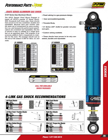 Phone: 1-877-560-0619SHOCKS75CRATE SERIES ALUMINUM GAS SHOCK21/27 Series Gas Aluminum Shock The AFCO Tamper Proof Shock Program is based off AFCO%u2019s popular 27 Series Shock. With thousands built every year, these shocks have proven to be very consistent, durable and repeatable. Because each part number uses the same set of components for every production run, and because the performance specifications are consistent and repeatable, this line of shocks is easy to validate by a single dyno test on an approved dyno. This program is an economy platform that is inexpensive to maintain for the racer. The average rebuild cost at the end of the season is $50 for labor, oil, and seals.%u2022 Fixed valving in a gas pressure design.%u2022 User serviceable/repairable.%u2022 Threaded Body.%u2022 21 Series: (5/8%u201d shaft) for greater rod pressure gain.%u2022 Custom valving available.%u2022 These shocks have proven to be very consistent, durable and repeatable4-LINK GAS SHOCK RECOMMENDATIONSLeft Rear Behind ShocksLeft Front ShocksLeft Rear Front / Traction ShocksRight Front ShocksRight Rear ShocksFifth Coil / Torque Arm ShocksGAS GAS GAS GAS GAS GASTRACKCONDITIONNON ADJ.BASE 2775DSLICK 2775-3DROUGH 2775DTRACKCONDITIONNON ADJ.BASE 2775-10SLICK 2773-10ROUGH 2774-8TRACKCONDITIONNON ADJ.BASE 21960SLICK 2196-2ROUGH 2195-3TRACKCONDITIONNON ADJ.BASE 2794SLICK 2793-6ROUGH 2793-6TRACKCONDITIONNON ADJ.BASE 2194SLICK 2195-3ROUGH 2194-5TRACKCONDITIONNON ADJ.BASE 2773-5SLICK 2773-7ROUGH 27732173-52173-72173-102173-1221742174-82174-921752175-32175-721762176-42192-42193 2193-521942194-6 2195 2196-02197-4 2198-22199-02199-12199-37%u201dSTROKE9%u201dSTROKESERIES STROKE COMPRESSION REBOUND21 7 4 - 621 SERIES*Custom valvings available at an additional charge5/8 Shaft2773-52773-72773-102773-1227742774-82774-927752775-32775-727762776-42792-42793 2793-527942794-6 2795 2796-02797-4 2798-22799-02799-12799-37%u201dSTROKE9%u201dSTROKESERIES STROKE COMPRESSION REBOUND27 7 4 - 627 SERIES*Custom valvings available at an additional charge1/2 ShaftCALL FOR AVAILABLESHOCK PACKAGES7%u201dCOMPRESSED EXTENDED13.53%u201d 20.47%u201dSTROKE9%u201d 15.53%u201d 24.47%u201d
