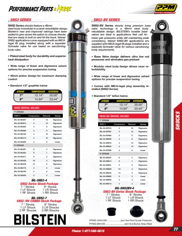 Phone: 1-877-560-0619SHOCKS77SNS2 SERIES SNS2-BV SERIESSNS2 Series shocks feature a 46mmsteel body monotube in a racer-rebuildable design. Bilstein%u2019s new and improved valvings have been added to give racers the option to choose shocks that are ready to bolt on and hit the track. Valved SNS2 applications come equipped with an IMCA legal fill plug installed along with a separate Schrader valve for use based on sanctioning body rules. %u2022 Plated steel body for durability and superior heat dissipation%u2022 Wide range of linear and digressive valved options for precise suspension tuning%u2022 46mm piston design for maximum damping control%u2022 Standard 1/2%u201d graphite heimsBIL-SNS2-7SNS2 /BV COMBO Shock Package7 %u201c Stroke1 LF Shock2 RF Shocks9%u201c Stroke2 LR Shocks2 RR ShocksSNS2-BV Series shocks bring premium base valve technology in a 46mm steel body rebuildable design. BILSTEIN%u2019s tunable base valves are ideal in applications that call for lower gas pressures while still maintaining peak consistency. Valved SNS2-BV applications are supplied with IMCA-legal fill plugs installed and a separate Schrader valve for various sanctioning body requirements. %u2022 Base Valve design delivers ultra low rod pressures and elminates gas preload%u2022 Modular steel body design allows racer rebuildability%u2022 Wide range of linear and digressive valved options for precise suspension tuning%u2022 Comes with IMCA-legal plug assembly installed (SNS2 Series)%u2022 Standard 1/2%u201d teflon heimsSNS2-BV SERIES, VALVED7%u201d STROKEPART # Compression ReboundBIL-33-298023BIL-33-297996 4 6BIL-33-298191BIL-33-298214BIL-33-297910 2 10BIL-33-297927 1 2 2BIL-33-297965 3 8BIL-33-298009 4 8BIL-33-298016 4 109%u201d STROKEBIL-33-298092BIL-33-298115BIL-33-298221BIL-33-298238BIL-33-298245BIL-33-2980854 123 58 29 19 210 212 23 34 4ValvingDigressiveLinearDigressiveDigressiveDigressiveDigressiveDigressiveDigressiveLinearDigressiveDigressiveDigressiveDigressiveLinearLinearSNS2 SERIES, VALVED7%u201d STROKEPART # Compression ReboundBIL-33-304113BIL-33-304083 4 6BIL-33-304281BIL-33-304304BIL-33-304007 2 10BIL-33-304014 1 2 2BIL-33-304052 3 8BIL-33-304090 4 8BIL-33-304106 4 109%u201d STROKEBIL-33-304182BIL-33-304205BIL-33-304311BIL-33-304328BIL-33-304335BIL-33-3041754 123 58 29 19 210 212 23 34 4ValvingDigressiveLinearDigressiveDigressiveDigressiveDigressiveDigressiveDigressiveLinearDigressiveDigressiveDigressiveDigressiveLinearLinearBIL-SNS2BV-4SNS2-BV Series Shock Package7 %u201c Stroke1 LF Shock1 RF Shock9%u201c Stroke1 LR Shock1 RR ShockBIL-SNS2-4SNS2 Series Shock Package7 %u201c Stroke1 LF Shock1 RF Shock9%u201c Stroke1 LR Shock1 RR Shock7%u201dCOMPRESSED EXTENDED13.14%u201d 20.00%u201dSTROKE9%u201d 14.94%u201d 23.44%u201d7%u201dCOMPRESSED EXTENDED13.14%u201d 20.00%u201dSTROKE9%u201d 14.94%u201d 23.44%u201dPPMS-CKN12M ....................Jam Nut Rod Guide ProtectorPPMS-BN12M ............................ Jam Nut Bump Stop Plate