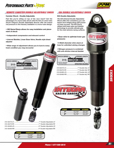 Phone: 1-877-560-0619SHOCKS81REMOTE CANISTER DOUBLE ADJUSTABLE SHOCK IDA Double Adjustable The IDA (Internal Double Adjustable) Shock offers the consistency you can expect from Integra along with proven on-track success. The IDA Shock utilizes both base valve and bladder technology to provide ultimate grip for the most extreme racing surfaces.%u2022 Base valve to optimize lower gas pressures%u2022 6 Multi-diameter shim stack allows for unlimited valving changes%u2022 Nitrogen pressure is contained with anti-stiction internal bladderSHOCK SERIES STROKE LENGTHSPECIFIES VALVING310- 604 7 0Call for specificvalving today!SHOCK SERIES STROKE LENGTHSPECIFIES VALVING310- 404 7 0Call for specificvalving today! 310 60470-LF ...........................7%u201d Double Adj. LF310 60470-RF ...........................7%u201d Double Adj. RF310 60490-LR ...........................9%u201d Double Adj. LR310 60490-RR ......................... 9%u201d Double Adj. RRCanister Shock - Double Adjustable Feel like you%u2019re sitting on top of the race track? Get the advantage of a mono-tube shock with the feel of a twin-tube shock! lntegra%u2019s Double Adjustable Shocks offer the lowest rod pressure in the industry available in a mono-tube design.%u2022 360 Swivel Banjo allows for easy installation and placement of shock%u2022 Independent compression and rebound control%u2022 Internal Bladder, Linear Base Valve, Needle style bleed adjuster%u2022 Wide range of adjustment allows you to tune to every track condition you may encounter 310 40470-LF ........................................................... 7%u201d Double Adjustable LF310 40470-RF ...........................................................7%u201d Double Adjustable RF310 40490-LR ...........................................................9%u201d Double Adjustable LR310 40490-RR ......................................................... 9%u201d Double Adjustable RR IDA DOUBLE ADJUSTABLE SHOCK7%u201dCOMPRESSED EXTENDED13.75%u201d 20.25%u201dSTROKE9%u201d 15.75%u201d 24.25%u201d7%u201dCOMPRESSED EXTENDED13.50%u201d 20.00%u201dSTROKE9%u201d 15.50%u201d 24.00%u201d