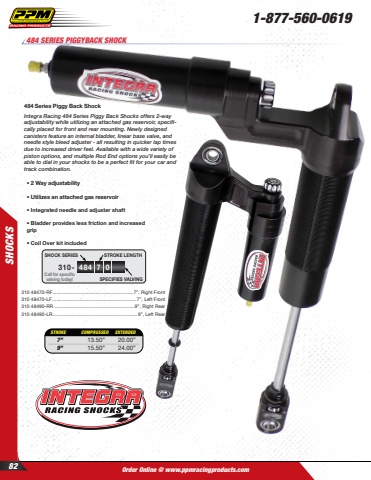 Order Online @ www.ppmracingproducts.comSHOCKS1-877-560-061982484 SERIES PIGGYBACK SHOCK310 48470-RF............................................................7%u201d, Right Front 310 48470-LF .............................................................. 7%u201d, Left Front310 48490-RR ............................................................9%u201d, Right Rear310 48490-LR...............................................................9%u201d, Left Rear484 Series Piggy Back Shock Integra Racing 484 Series Piggy Back Shocks offers 2-way adjustability while utilizing an attached gas reservoir, specifically placed for front and rear mounting. Newly designed canisters feature an internal bladder, linear base valve, and needle style bleed adjuster - all resulting in quicker lap times due to increased driver feel. Available with a wide variety of piston options, and multiple Rod End options you%u2019ll easily be able to dial in your shocks to be a perfect fit for your car and track combination.%u2022 2 Way adjustability%u2022 Utilizes an attached gas reservoir%u2022 Integrated needle and adjuster shaft%u2022 Bladder provides less friction and increased grip%u2022 Coil Over kit includedSHOCK SERIES STROKE LENGTHSPECIFIES VALVING310- 484 7 0Call for specificvalving today!7%u201dCOMPRESSED EXTENDED13.50%u201d 20.00%u201dSTROKE9%u201d 15.50%u201d 24.00%u201d