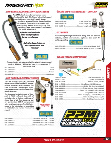 Phone: 1-877-560-0619SHOCKS87LMP SERIES ADJUSTABLE SHOCKSOTJ SERIES%u00d6HLINS TOOLS & COMPONENTS%u00d6HLINS END EYE ASSEMBLIES - LMP/LMJOHL-U01781-01 ....................................................... %u00d6HLINS Gas Filling ToolPPMS-T111W ............................................................ %u00d6HLINS Shock Wrench OHL-00778-01 ........................................................ Inflation Needle, 22G 1.5OHL-01473-06 ..................................... %u00d6hlins Circlip SRH 8.3 StainlessOHL-05018-02 ...............................................%u00d6hlins Coil Over Nut LMJ/LMPOHL-00629-04 ............................................%u00d6hlins Coil Over Cone LMJ/LMPOHL-00629-20 .....................................%u00d6hlins Coil Over Flat Cone LMJ/LMPOHL-01293-05A ..............................................Spring Slider Guide LMJ/LMPOHL-30550 ......................................%u00d6hlins Dual Spring Lock Nut, LMJ, LMPOHL-30551 .................................................. %u00d6hlins Dual Stage Lock Nut, ILXOHL-30553 ................................................%u00d6hlins Dual Stage Lock Nut, LMRPPMS-T111WOHL-OTJ1960 ............................................... OTJ Series Shock, 5th 7%u201dOHL-OTJ2592 ........................... OTJ Series Shock, LR Front 9%u201d StrokeFeatures lightweight aluminum body and are easy to rebuild, reshim and service. Optional Coil-Over Kit sold separately.The LMR shock absorber series has been developed for Late Model and other Motorsport applications. A new shaft needle design produces an equal feeling throughout the click range. These shocks are using high strength light weight aluminum body. The outertube has a new course thread design for quick adjustment.OHL-LMR2390 ........................................................................................ RearOHL-LMR2070 ....................................................................................... FrontOHL-LMR2410 ................................................................................. Left RearOHL-LMR1970 ..............................................................................Right FrontCylinder head design to allow multiple options for top eye changesThese shocks are easy to dial-in, rebuild, re-shim and service. All Rear LMR series shocks come with a 2%u201d extension end.Swiveling hose design on both cylinder head and reservoirOHL-01054-26M ............................... 2%u201d Ext Length AdjOHL-01054-27M ............................... 1%u201d Ext Length AdjOHL-01255-18 ............................. Standard Length AdjThe LMP is based off of the championship winning LMJ shock but is upgraded to a piggyback style reservoir. The LMP piggy back cylinder head offers many advantages over the hose style shock absorber. The large port cylinder heads oil flow path is highly efficient. Less risk of cavitation due to the less restricted, efficient flow of oil. They feature a better performing 808-R compression valve and have improved reliability because of the elimination of hose. Ease of installation, no remote reservoir to mount.OHL-LMP2072 ............................................ LMP Series Shock, LF 7%u201d StrokeOHL-LMP2073 ............................................LMP Series Shock, RF 7%u201d StrokeOHL-LMP2392 ............................................LMP Series Shock, LR 9%u201d StrokeOHL-LMP2393 ........................................... LMP Series Shock, RR 9%u201d StrokeCall for specificvalving today!LMR SERIES ADJUSTABLE OFF ROAD SHOCKS