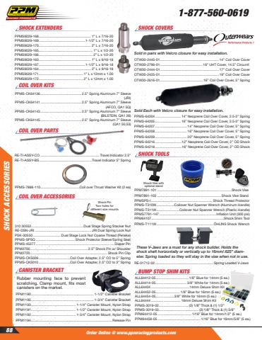 Order Online @ www.ppmracingproducts.comSHOCK ACCESSORIES1-877-560-061988CANISTER BRACKETCOIL OVER ACCESSORIESCOIL OVER PARTSCOIL OVER KITSSHOCK EXTENDERSRE-TI-ASSY-CO .............................................................. Travel Indicator 2.5%u201dRE-TI-ASSY-BS .......................................................Travel Indicator 5%u201d SpringPPMS-7888-110 .........................................Coil over Thrust Washer Kit (2 ea)310 30552.......................................................Dual Stage Spring Stacker NutRE-DSN-JRI ........................................................... JRI Dual Spring Lock NutPSK-30550 ............................. Dual Stage Lock Nut Coarse Thread (Penske)PPMS-SPSQ ......................................... Shock Protector Sleeve/Spring Seat PPMS-45277.................................................................................. Diaper PinPPM2700.............................................................2.5%u201d Shock Pin w/ Shoulder PPM2720................................................................................. Shock Pin ClipPPMS-CK5009.................................Coil Over Adapter, 2.5%u201d CO to 5%u201d SpringPPMS-CK5010.................................Coil Over Adapter, 2.5%u201d CO to 3%u201d SpringSold in pairs with Velcro closure for easy installation.OTW30-2445-01 ..............................................................14%u201d Coil Over CoverOTW30-2796-01 .............................................16%u201d UHT Cover, 14.5%u201d Circumf.OTW30-2444-01 ..............................................................17%u201d Coil Over CoverOTW30-2425-01 ..............................................................19%u201d Coil Over CoverOTW30-2616-01............................................. 16%u201d Coil Over Cover, 5%u201d SpringSold Each with Velcro closure for easy installation.PPMS-64204........................... 14%u201d Neoprene Coil Over Cover, 2.5-3%u201d SpringPPMS-64205........................... 16%u201d Neoprene Coil Over Cover, 2.5-3%u201d SpringPPMS-64207................................. 14%u201d Neoprene Coil Over Cover, 5%u201d SpringPPMS-64208................................. 16%u201d Neoprene Coil Over Cover, 5%u201d SpringPPMS-64209................................. 20%u201d Neoprene Coil Over Cover, 5%u201d SpringPPMS-64216............................12%u201d Neoprene Coil Over Cover, 2%u201d OD ShockPPMS-64218............................16%u201d Neoprene Coil Over Cover, 2%u201d OD ShockPPMS9029-168......................................................... 1%u201d L x 7/16-20PPMS9029-169...................................................1-1/2%u201d L x 7/16-20PPMS9029-170......................................................... 2%u201d L x 7/16-20 PPMS9029-165........................................................... 1%u201d L x 1/2-20 PPMS9029-166........................................................... 2%u201d L x 1/2-20 PPMS9029-163......................................................... 1%u201d L x 9/16-18 PPMS9029-167...................................................1-1/2%u201d L x 9/16-18 PPMS9029-164......................................................... 2%u201d L x 9/16-18 PPMS9029-171.................................................1%u201d L x 12mm x 1.00PPMS9029-172.................................................2%u201d L x 12mm x 1.00Shock PinTwo holes for different size mounts PPM7891-101 ..............................................................................Shock VisePPM7891-102 ................................................................... Shock Vise StandPPMSPS-I ................................................................ Shock Thread ProtectorPPMS-T310W...................Coilover Nut Spanner Wrench (Aluminum Handle)PPMS-T311W........................Coilover Nut Spanner Wrench (Plastic Handle)PPMS7791-147............................................................Inflation Unit (300 psi)PPM64107............................................................................Shock Shim ToolPPMS-T111W ............................................................%u00d6HLINS Shock Wrench Shock Vise with optional standThese V-Jaws are a must for any shock builder. Holds the shock shaft horizontally or vertically up to 16mm/.625%u201d diameter. Spring loaded so they will stay in the vise when not in use.RE-01712-02 ............................................................. Spring Loaded V-JawsPPM1190 .................................................................. 1-1/2%u201d Canister BracketPPM1195 .................................................................. 1-3/4%u201d Canister BracketPPM1193 ............................................... 1-1/4%u201d Canister Mount, Nylon StrapPPM1191 ............................................... 1-1/2%u201d Canister Mount, Nylon StrapPPM1192 ............................................... 1-3/4%u201d Canister Mount, Nylon StrapPPM1194 ..................................................................................... Release PinRubber mounting face to prevent scratching. Clamp mount, fits most canisters on the market.PPMS-CK64136 ........................................... 2.5%u201d Spring Aluminum 7%u201d Sleeve (JRI)PPMS-CK64141 ........................................... 2.5%u201d Spring Aluminum 7%u201d Sleeve (AFCO, QA1 5Q)PPMS-CK64143 ........................................... 2.5%u201d Spring Aluminum 7%u201d Sleeve (BILSTEIN, QA1 26)PPMS-CK64145 ........................................... 2.5%u201d Spring Aluminum 7%u201d Sleeve (QA1 50,53)SHOCK COVERSSHOCK TOOLSALL64412-05 .................................. 1/8%u201d Blue for 14mm (5 ea.)ALL64414-05 ................................ 3/8%u201d White for 14mm (5 ea.)ALL64404 ........................................14mm Deluxe Shim KitALL64452-05 ......................... 1/8%u201d Blue for 16mm (5 ea.)ALL64454-05 ...................3/8%u201d Whi