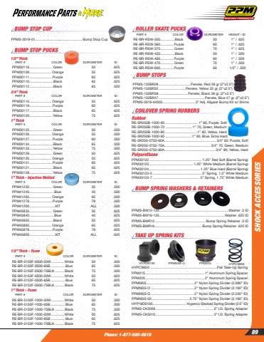 Phone: 1-877-560-0619SHOCK ACCESSORIES89ROLLER SKATE PUCKSBUMP STOP PUCKSBUMP STOPSBUMP STOP CUPPPMS-132BR28 .................................Penske, Red 28 gr (2%u201dx2.5%u201d)PPMS-132BR32 ............................Penske, Yellow 32 gr, (2%u201dx2.5%u201d)PPMS-132BR38 .............................. Penske, Black 38 gr, (2%u201dx2.5%u201d)PPMS-132BR47 ................................................Penske, Blue 47 gr, (2%u201dx2.5%u201d)PPMS-3019-64505 ..................................3%u201d Adj. Allgaier Bump Kit w/ ShimsPPMS-3019-01 ................................................. Bump Stop Cup1/2%u201d Thick3/4%u201d Thick1%u201d Thick1%u201d Thick - Injection Molded1/2%u201d Thick - Foam1%u201d Thick - FoamCOILOVER SPRING RUBBERSRubberRE-SR250B-1000-60 .................................. 1%u201d 60, Purple, SoftRE-SR250B-1000-70 ............................ 1%u201d 70, Green, MediumRE-SR250B-1000-80 ................................. 1%u201d 80, Yellow, HardRE-SR250B-1000-90 ............................1%u201d 90, Blue, Extra HardRE-SR250-0750-60A ...................................................... 3/4%u201d 60, Purple, SoftRE-SR250-0750-70A ................................................ 3/4%u201d 70, Green, MediumRE-SR250-0750-80A ..................................................... 3/4%u201d 80, Yellow, HardPolyurethanePPM30122 ....................................................... 1.25%u201d Red Soft (Barrel Spring) PPM30123 .............................................. 1.25%u201d White Medium (Barrel Spring)PPM30124 ......................................................1.25%u201d Blue Hard (Barrel Spring)PPM30123-5 ................................................... 5%u201d Spring, 1.5%u201d White MediumPPM30123-7 ................................................. 5%u201d Spring, 1.75%u201d White Medium HYPCS650 ......................................................................Flat Take-Up SpringPPM215 ..............................................................1%u201d Aluminum Spring SpacerPPM225 ..............................................................2%u201d Aluminum Spring SpacerPPMNSS ................................................. 2%u201d Nylon Spring Divider (2.090%u201d ID)PPMNSS-O ............................................. 2%u201d Nylon Spring Divider (2.190%u201d ID)PPMNSS-Q ............................................. 2%u201d Nylon Spring Divider (2.230%u201d ID)PPMNSS-02 ....................................... 2.75%u201d Nylon Spring Divider (2.190%u201d ID)HYP18DS100 ..................................... Hyperco Stacked Spring Divider (2.5%u201d ID)PPMS-CK5009 ............................................................ 5%u201d I.D. Spring AdapterPPMS-CK5010 ............................................................ 3%u201d I.D. Spring AdapterHYPDS100 PPMNSS-O PPM225 HYPCS650PPM30125........................ Green 50 .500PPM30126....................... Orange 55 .500 PPM30127........................Purple 60 .500 PPM30134.........................Black 65 .500 PPM30133........................Yellow 75 .500PPM30129........................ Green 50 .625PPM30130....................... Orange 55 .625PPM30131........................Purple 60 .625PPM30121.........................Black 65 .625PPM30128........................Yellow 75 .625PART # COLOR DUROMETER IDPPM30115....................... Orange 55 .625PPM30119........................Purple 60 .625PPM30117.........................Black 65 .625PPM30120........................Yellow 75 .625PART # COLOR DUROMETER IDPPM30116........................ Green 50 .625PPM30109....................... Orange 55 .625PPM30111........................Purple 60 .625PPM30110.........................Black 65 .625PPM30112.........................Black 65 .500PART # COLOR DUROMETER IDPPM41235........................ Green 35 .500PPM41240..........................Blue 40 .500 PPM41265....................... Orange 65 .500 PPM41278........................Purple 78 .500PPM41200...........................KIT ALL .500PPM45835........................ Green 35 .625PPM45840..........................Blue 40 .625 PPM45855.........................Black 55 .625 PPM45865....................... Orange 65 .625 PPM45878........................Purple 78 .625PPM45800...........................KIT ALL .625PART # COLOR DUROMETER IDRE-BR-5150F-0500-50W............. White 50 .500RE-BR-5150F-0500-65B............... Blue 65 .500RE-BR-5150F-0500-75BLK ......... Black 75 .500RE-BR-5153F-0500-50W............. White 50 .625RE-BR-5153F-0500-65B............... Blue 65 .625RE-BR-5153F-0500-75BLK ......... Black 75 .625PART # COLOR DUROMETER IDRE-BR-RSW-350...............Black 50 1%u201d / .625RE-BR-RSW-360..............Purple 60 1%u201d / .625RE-BR-RSW-370.............. Green 70 1%u201d / .625RE-BR-RSW-450...............Black 50 1%u201d / .500RE-BR-RSW-460..............Purple 60 1%u201d / .500 RE-BR-RSW-470.............. Green 70 1%u201d / .500 RE-BR-RSW-660..............Purple 60 1/2%u201d / .500PART # COLOR DUROMETER HEIGHT / IDPPMS-BW12-125 ........................................................................Washer .5 IDPPMS-BW16-125 ....................................................................Washer .625 IDPPMS-BWR12 .....................................................Bump Spring Retainer .5 IDPPMS-BWR16 .................................................Bump Spring Retainer .625 IDBUMP SPRING WASHERS & RETAINERSTAKE UP SPRING KITSRE-BR-5150F-1000-50W............. White 50 .500RE-BR-5150F-1000-65B............... Blue 65 .500RE-BR-5150F-1000-75BLK ......... Black 75 .500RE-BR-5153F-1000-50W............. White 50 .625RE-BR-5153F-1000-65B............... Blue 65 .625RE-BR-5153F-1000-75BLK ......... Black 75 .625PART # COLOR DUROMETER ID