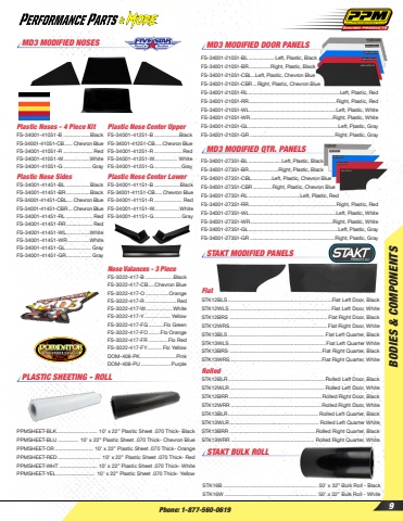 BODIES & COMPONENTSPhone: 1-877-560-0619 9FS-34001-27351-BL ........................Left, Plastic, BlackFS-34001-27351-BR ......................Right, Plastic, BlackFS-34001-27351-CBL...............Left, Plastic, Chevron BlueFS-34001-27351-CBR ..............Right, Plastic, Chevron BlueFS-34001-27351-RL ......................................Left, Plastic, RedFS-34001-27351-RR................................................................Right, Plastic, RedFS-34001-27351-WL ...............................................................Left, Plastic, WhiteFS-34001-27351-WR.............................................................Right, Plastic, WhiteFS-34001-27351-GL..................................................................Left, Plastic, GrayFS-34001-27351-GR ..............................................................Right, Plastic, GrayMD3 MODIFIED QTR. PANELSFS-34001-21051-BL ...................Left, Plastic, BlackFS-34001-21051-BR ................Right, Plastic, BlackFS-34001-21051-CBL...Left, Plastic, Chevron BlueFS-34001-21051-CBR ...Right, Plastic, Chevron BlueFS-34001-21051-RL ...................................................................Left, Plastic, RedFS-34001-21051-RR................................................................Right, Plastic, RedFS-34001-21051-WL ...............................................................Left, Plastic, WhiteFS-34001-21051-WR.............................................................Right, Plastic, WhiteFS-34001-21051-GL..................................................................Left, Plastic, GrayFS-34001-21051-GR ..............................................................Right, Plastic, GrayMD3 MODIFIED DOOR PANELSSTK16B ................................................................ 50%u2019 x 32%u201d Bulk Roll - BlackSTK16W ............................................................... 50%u2019 x 32%u201d Bulk Roll - WhiteSTAKT BULK ROLLSTAKT MODIFIED PANELSFlatSTK12BLS .......................................................................Flat Left Door, BlackSTK12WLS ..................................................................... Flat Left Door, WhiteSTK12BRS ................................................................... Flat Right Door, BlackSTK12WRS ...................................................................Flat Right Door, WhiteSTK13BLS .................................................................. Flat Left Quarter, BlackSTK13WLS ..................................................................Flat Left Quarter WhiteSTK13BRS ...............................................................Flat Right Quarter, BlackSTK13WRS ...............................................................Flat Right Quarter, WhiteRolledSTK12BLR .................................................................. Rolled Left Door, BlackSTK12WLR .................................................................Rolled Left Door, WhiteSTK12BRR ...............................................................Rolled Right Door, BlackSTK12WRR ..............................................................Rolled Right Door, WhiteSTK13BLR ..............................................................Rolled Left Quarter, BlackSTK13WLR ............................................................. Rolled Left Quarter WhiteSTK13BRR ...........................................................Rolled Right Quarter, BlackSTK13WRR ......................................................... Rolled Right Quarter, WhiteMD3 MODIFIED NOSESNose Valances - 3 PieceFS-3022-417-B ...................BlackFS-3022-417-CB ....Chevron BlueFS-3022-417-O ................OrangeFS-3022-417-R .....................RedFS-3022-417-W .................. WhiteFS-3022-417-Y .................. YellowFS-3022-417-FG ..........Flo GreenFS-3022-417-FO ........Flo OrangeFS-3022-417-FR .............Flo RedFS-3022-417-FY .......... Flo YellowDOM-408-PK .........................PinkDOM-408-PU ....................PurplePlastic Noses - 4 Piece KitFS-34001-41051-B ..................BlackFS-34001-41051-CB...... Chevron BlueFS-34001-41051-R .................... RedFS-34001-41051-W..................WhiteFS-34001-41051-G ................... GrayPlastic Nose Center UpperFS-34001-41251-B .................BlackFS-34001-41251-CB.....Chevron BlueFS-34001-41251-R ...................RedFS-34001-41251-W................ WhiteFS-34001-41251-G ..................GrayPlastic Nose Center LowerFS-34001-41151-B .................BlackFS-34001-41151-CB..... Chevron BlueFS-34001-41151-R ................... RedFS-34001-41151-W.................WhiteFS-34001-41151-G .................. GrayPlastic Nose SidesFS-34001-41451-BL ................BlackFS-34001-41451-BR................BlackFS-34001-41451-CBL.... Chevron BlueFS-34001-41451-CBR... Chevron BlueFS-34001-41451-RL .................. RedFS-34001-41451-RR.................. RedFS-34001-41451-WL................WhiteFS-34001-41451-WR...............WhiteFS-34001-41451-GL ................. GrayFS-34001-41451-GR................. GrayPPMSHEET-BLK............................ 10%u2019 x 22%u201d Plastic Sheet .070 Thick- BlackPPMSHEET-BLU .............. 10%u2019 x 22%u201d Plastic Sheet .070 Thick- Chevron BluePPMSHEET-OR .......................... 10%u2019 x 22%u201d Plastic Sheet .070 Thick- OrangePPMSHEET-RED ............................. 10%u2019 x 22%u201d Plastic Sheet .070 Thick- RedPPMSHEET-WHT .......................... 10%u2019 x 22%u201d Plastic Sheet .070 Thick- WhitePPMSHEET-YEL.......................... 10%u2019 x 22%u201d Plastic Sheet .070 Thick- YellowPLASTIC SHEETING - ROLL