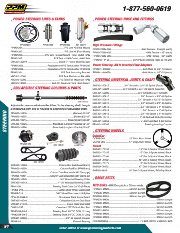 Order Online @ www.ppmracingproducts.comSTEERING1-877-560-061994STEERING WHEELSSTEERING UNIVERSAL JOINTS & SHAFTCOLLAPSIBLE STEERING COLUMNS & PARTSPOWER STEERING LINES & TANKSPPM01204 ................................................................P/S Line Kit (Rear Mount)PPM01205 ................................................................ P/S Line Kit (Front Mount)PPM01206 .................................. P/S Tank Firewall Mount -10AN Outlet -6ANPPM01202 ................................................P/S Tank -10AN Outlet, -6AN SideSWE301-30071 ............................................... Sweet 7%u201d Power Steering TankPPM01202L .................................... Replacement P/S Tank Lid for PPM1202PPM01206L .................................... Replacement P/S Tank Lid for PPM1206PPM01201 ...........................................................P/S Tank Mounting BracketKRC91510000 ..................................................P/S Tank Flat Mount RH -6ANKRC91515000 .................................................. P/S Tank Flat Mount LH -6ANKRC91318000 .......................................Bolt-On Reservoir Tank -8AN ReturnPPM01205 PPM01202 PPM01206 301-30071SWE401-50615 ...................... 3/4%u201d Smooth x 3/4%u201d-30 Spline (Rack)SWE401-50621 .................... 3/4%u201d Smooth x 3/4%u201d-20 Spline (Column)SWE401-50606 ............................................3/4%u201d Smooth x 3/4%u201d SmoothSWE401-50610 ............................................... 3/4%u201d Smooth x 3/4%u201d-48 SplineSWE401-50611 ........................................... 3/4%u201d Smooth x 13/16%u201d-36 SplineSWE401-50612 ............................................... 3/4%u201d Smooth x 3/4%u201d-36 SplineSWE401-51518 ................................................3/4%u201d-30 Spline x 1%u201d-48 SplineSWE401-50618 .................................................. 3/4%u201d Smooth x 1%u201d-48 SplineSWE401-51818 ................................................3/4%u201d-48 Spline x 1%u201d-48 SplineSWE405-10410 ............................................. 1%u201d-48 Splined Stub (Chromoly)SWE401-50656 ............................................... U-Joint Jam Nut & Set ScrewPPM401-52306 ..................................................... Steering Loading CouplerSWE601-70151 .............................................15%u201d Flat 3-Spoke Wheel, BlackSWE601-70152 .................................................15%u201d DIsh 3-Spoke Wheel, Black SWE601-70161 .............................................16%u201d Flat 3-Spoke Wheel, BlackSWE601-70162 .................................................16%u201d Dish 3-Spoke Wheel, BlackSWE601-70171 ............................................. 17%u201d Flat 3-Spoke Wheel, BlackSWE601-70172 .................................................17%u201d Dish 3-Spoke Wheel, BlackSWE601-80161 .................................16%u201d Dish 3-Spoke Wheel, BIG Grip BlackQCP68-001 ................................... 15%u201d Dish Alum WheelQCP68-002 ...................................17%u201d Dish Alum WheeIQuickCarSweet405-10150001-21040PPM1150PPM405-10310 ............................................................................(Rodend) 22-32%u201dPPM405-10325 .............................................................................(Rodend)32-42%u201dSWE405-10315 .................................................................. (Rodend) (GRT) 28-34%u201dSWE405-10326 ..........................................(Monoball) (Longhorn/Capital) 32-42%u201dPPM405-10326 ..........................................(Monoball) (Longhorn/Capital) 32-42%u201dAdjustable columns eliminate flex & bind in the steering shaft. Length is measured from end of housing to beginning of adjustable shaft.405-10310SWE405-10369 .................................................... Column Rod End (Sweet Brand)PPM405-10369 ...................................................... Column Rod End (PPM Brand)PPM405-10150 ......................................Column Dash Brackets 9-3/8%u201d Clamp (pr)PPM405-10151 ......................................Column Dash Brackets 6-3/8%u201d Clamp (pr)PPM405-10240 ...................................................... 3/4%u201d Monoball Steering CollarSWE405-10243 ...................................................1-1/8%u201d Monoball Steering CollarPPM1150 ....................................................Steering Shaft Collar 3/4%u201dID (2-Piece)PPM68-010 ...........................................................Button Style Wheel DisconnectPPM68-015 ...................................................... 360%u00b0 Wheel Disconnect 19-SplineOTW-32-2988-01 ................................................. Shockwear Rack Armor GuardSWE405-10040 .....................................................Collapsible Column Dust BootSWE001-21040 ................................................................. Sweet Rack Dust BootCMR12-757 ......................................................Oversized .757%u201dID Shaft Rod EndPPMDOM-3/4-3 .........................................Steering Shaft 3/4%u201dOD DOM, 3%u2019 LongPPMDOM-3/4-6 .........................................Steering Shaft 3/4%u201dOD DOM, 6%u2019 LongSWE301-30120 ................................................................3/4%u201d-36 Splined, CouplerPPM9192 ............................................................................... Firewall Bearing405-10240 PPM68-015HTD Belts - 8M20m pitch x 20mm wide.PPM524-8M20 ...............................524mm LengthPPM536-8M20 ...............................536mm LengthPPM560-8M20 ...............................560mm LengthPPM576-8M20 ........................................................................ 576mm LengthPPM600-8M20 ........................................................................ 600mm LengthPPM624-8M20 ........................................................................ 624mm LengthPPM6