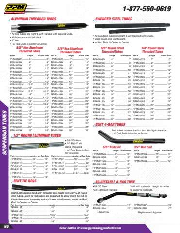 Order Online @ www.ppmracingproducts.comSUSPENSION TUBES1-877-560-0619965/8%u201d Rod EndPPM5809BB.............9%u201d............. 12%u201dPPM5810BB............10%u201d............ 13%u201dPPM5811BB............11%u201d ........... 14%u201dPPM5812BB............12%u201d ........... 15%u201dPPM5813BB............13%u201d............ 16%u201dPPM5814BB............14%u201d............ 17%u201dPPM5815BB............15%u201d............ 18%u201d3/4%u201d Rod EndPPM3411BB............11%u201d............ 14%u201dPPM3412BB............12%u201d............ 15%u201dPPM3413BB............13%u201d ........... 16%u201d%u2022 All Hex Tubes are Right & Left Handed with Tapered Ends.%u2022 All tubes are anodized black.%u2022 1%u201d Hex.%u2022 w/ Rod Ends is Center to Center.5/8%u201d Hex AluminumThreaded TubesPart # ....................... Length........ w/ Rod EndsPPM5805H ......... 5%u201d ......................8%u201dPPM5806H ......... 6%u201d ......................9%u201dPPM5807H ......... 7%u201d ....................10%u201dPPM5808H ......... 8%u201d ....................11%u201dPPM5809H ......... 9%u201d ....................12%u201dPPM5810H ........ 10%u201d ..................13%u201dPPM5811H ........ 11%u201d ..................14%u201dPPM5812H ........ 12%u201d ..................15%u201dPPM58125H .....12.5%u201d ..............15.5%u201dPPM5813H ........ 13%u201d ..................16%u201dPPM58135H .....13.5%u201d ..............16.5%u201dPPM5814H ........ 14%u201d ..................17%u201dPPM58145H .....14.5%u201d ..............17.5%u201dPPM5815H ........ 15%u201d ..................18%u201dPPM58155H .....15.5%u201d ..............18.5%u201dPPM5816H ........ 16%u201d ..................19%u201dPPM5817H ........ 17%u201d ..................20%u201dPPM5818H ........ 18%u201d ...................21%u201dPPM5819H ........ 19%u201d ...................22%u201dPPM5820H ........ 20%u201d ...................23%u201dPPM5821H ........ 21%u201d ...................24%u201dPPM5822H ........ 22%u201d ...................25%u201dPPM5823H ........ 23%u201d ...................26%u201d3/4%u201d Hex AluminumThreaded TubesPart # ....................... Length.........w/ Rod EndsPPM3407H ......... 7%u201d .................. 10%u201dPPM3408H ......... 8%u201d ................... 11%u201d PPM3409H ......... 9%u201d .................. 12%u201dPPM3410H ........ 10%u201d ................. 13%u201dPPM3411H ........ 11%u201d ................. 14%u201dPPM3412H ........ 12%u201d ................. 15%u201dPPM3413H ........ 13%u201d ................. 16%u201dPPM3414H ........ 14%u201d ................. 17%u201dPPM3415H ........ 15%u201d ................. 18%u201dPPM3416H ........ 16%u201d ................. 19%u201dPPM3417H ........ 17%u201d ................. 20%u201dPPM3418H ........ 18%u201d ................. 21%u201dPPM3419H ........ 19%u201d ................. 22%u201dPPM3420H ........ 20%u201d ................. 23%u201dPPM3421H ........ 21%u201d ................. 24%u201dPPM3422H ........ 22%u201d ................. 25%u201dPPM3423H ........ 23%u201d ................. 26%u201dPPM3424H ........ 24%u201d ................. 27%u201dPPM3425H ........ 25%u201d ................. 28%u201dPPM3426H ........ 26%u201d ................. 29%u201dPPM3427H ........ 27%u201d ................. 30%u201dPPM3428H ........ 28%u201d ................. 31%u201dPPM3429H ........ 29%u201d ................. 32%u201dPPM5815T.............................................15%u201d .............................................. 18%u201dPPM5816T.............................................16%u201d............................................... 19%u201dPPM58165T.........................................16.5%u201d ......................................... 19.5%u201dPPM5817T.............................................17%u201d............................................... 20%u201dPPM5818T.............................................18%u201d .............................................. 21%u201dRight/Left Handed hand 5/8%u201d threaded and made from 7/8%u201d O.D. round steel tubes. Bent tie rod tubes are designed to allow more tie rod to frame clearance. Increases rod end travel misalignment angle. w/ Rod Ends is Center to Center.%u2022 All Swedged Tubes are Right & Left Handed with Knurls.%u2022 Black Oxide and Lightweight.%u2022 w/ Rod Ends is Center to Center.3/4%u201d Round SteelThreaded TubesPart # ...................... Length...........w/Rod EndsPPM3407S ........ 7%u201d .................... 10%u201dPPM3408S ........ 8%u201d .................... 11%u201dPPM3409S ........ 9%u201d .................... 12%u201dPPM3410S ....... 10%u201d .................. 13%u201dPPM3411S ....... 11%u201d .................. 14%u201dPPM3412S ....... 12%u201d .................. 15%u201dPPM3413S ....... 13%u201d ................... 16%u201dPPM3414S ....... 14%u201d ................... 17%u201dPPM3415S ....... 15%u201d .................. 18%u201dPPM3416S ....... 16%u201d ................... 19%u201dPPM3417S ....... 17%u201d ................... 20%u201dPPM3418S ....... 18%u201d ................... 21%u201dPPM3419S ....... 19%u201d ................... 22%u201dPPM3420S ....... 20%u201d ................... 23%u201dPPM3421S ....... 21%u201d ................... 24%u201dPPM3422S ....... 22%u201d ................... 25%u201dPPM3423S ....... 23%u201d ................... 26%u201dPPM3424S ....... 24%u201d .................. 27%u201d5/8%u201d Round SteelThreaded TubesPart # ...................... Length.......... w/ Rod EndsPPM5804S ........ 4%u201d ......................7%u201dPPM5805S ........ 5%u201d ......................8%u201dPPM5806S ........ 6%u201d ......................9%u201dPPM5807S ........ 7%u201d ....................10%u201dPPM5808S ........ 8%u201d ....................11%u201dPPM5809S ........ 9%u201d ....................12%u201dPPM5810S ....... 10%u201d ...................13%u201dPPM5811S ....... 11%u201d ...................14%u201dPPM5812S ....... 12%u201d ...................15%u201dPPM