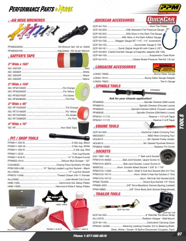 Phone: 1-877-560-0619TOOLS97QUICKCAR ACCESSORIESENGINE TOOLSSOCKETSTRAILER TOOLS-AN HOSE WRENCHESGAFFER%u2019S TAPELONGACRE ACCESSORIESPIT / SHOP TOOLSQCP-64-253 ......................................................... 8%u2019 Ratchet Tie-Down StrapALL12216 ........................................................Radiator Hanger - Wall MountQCP-64-140 ...........................................................Carburetor Carrying CasePPM401-52306 .................. Steering Loading Coupler, 3/4 in Steering Shaft, Steel, Allstar / Sweet 19 Spline Disconnect Couplers, EachQCP-64-140QCP-64-253LON52-79005 ...................................................................Bump Steer GaugeLON52-79121 ..................................................... Bump Steer Gauge AdapterLON52-79622 ............................................................................ Toe-In GaugePPM0920Ask for your chassis application!PPM0900 ............................................................Spindle Checker (GM Lower)PPM0910 .................................................... Spindle Checker (Chrysler Lower)PPM0920 .........................................Spindle Checker (GM & Chrysler Lowers)PPM0930 .................................................Spindle Checker (GM Metric Lower)PPM161-11170 .........................................................Reamer 1-1/2 in/ft TaperPPM161-11172 ...............................................................Reamer 2 in/ft TaperQCP-64-704 ...............................................................Alum Toe PlatesQCP-56-020 ............................20lb Standard Tire Pressure GaugeQCP-56-022 ............................20lb Glow in the Dark Tire GaugeQCP-56-242 ..................... 40lb Glow in the Dark Inflator GaugeQCP-64-706 ............Stagger Gauge 65%u201d-115%u201d, 1/4%u201d incrementsQCP-56-155 .........................................Durometer Gauge 0-100QCP-56-161 ................ Quick Digital Angle Kit with Case (1.25%u201d)QCP-56-830 . Caster/Camber Gauge w/magnetic adapter (56-130)QCP-66-100 ...............................................................Suspension Tube RulerQCP-64-510 ......................................Caliper Brake Pressure Test Kit 1/8 npt2%u201d Wide x 165%u2019ISC-3001DF..............................................................................................RedISC-3006DF...........................................................................................WhiteISC-3004DF...........................................................................................BlackISC-3003DF..........................................................................................Yellow2%u201d Wide x 150%u2019ISC-RT9210NDF......................................................Flo OrangeISC-RT9203NDF...................................................... Flo YellowISC-RT9207NDF.......................................................Flo GreenISC-RT9208NDF.......................................................... Flo Pink2%u201d Wide x 45%u2019ISC-RT7203NDF...........................................................Flo OrangeISC-RT7210NDF..........................................................Flo YellowISC-RT7207NDF...........................................................Flo GreenISC-RT7208NDF..............................................................Flo Pink4%u201d Wide x 10%u2019ISC-RT.................................................................. Non Skid TapePPM911-500-B .....................................................................5 Gal Jug, BlackPPM911-500-W .................................................................... 5 Gal Jug, WhitePPM911-500-R .......................................................................5 Gal Jug, RedPPM911-5225 ....................................................................... Fuel Jug NozzlePPM911-818-R .............................................................. 14%u201d D-Shape FunnelPPM955-4310 .......................................................Deluxe Mud Scraper - 32%u201dCHA48532......................................................Champ Pans Synthetic Pit MatPPM1200-LNS ........................... 12%u201d Spring Loaded Lug Nut Socket - BlackALL10240 ........................................................................ 12%u201d Lug Nut SocketPPM70-11048 .................................................Thread Chaser 5/8-11 FemaleALL23302 .....................................................................Late Model Car CoverHMS-1055 ..........................................................Hammond 5x5 Setup PlatesHMS-10W5................................................... Hammond Wide 5 Setup PlatesPPM911-818-R PPM911-500-RCHA48532ALL23302QCP-64-020 ...................................................QuickCar Cable Crimping ToolMSD35051 ...............................................................MSD Wire Crimping ToolHOL8012 .................................................................Mr. Gasket Pulley HolderHOL8013 ...........................................................Mr. Gasket Flywheel WrenchPPM626-10680 ................................................................ Radiator Fin CombQA1-1891-106.......................................... 1%u201d Ball Joint SocketPPM1210-40050 ................Ball Joint Socket, Upper Screw-InPPM1210-40075 .................Ball Joint Socket, Lower Screw-InWIN3153.....................Alum. Double Sided Socket 1 3/8%u201d & 1 7/8%u201dPPM1210-11000 .......................Alum. Wide 5 Hub Nut Socket (Std 3/4 Ton)PPM1210-10114 .................................Alum. Wide 5 Hub Nut Socket (1 Ton)PPM1210-10115 ..........................................Alum. GN Hub Nut Socket (5x5)PPMS-T642W ................................................... Shock Eye Socket 1/2%u201d DrivePPM56-2001 ............................3/8%u201d Drive Beadlock Socket (Spring Loaded)PPM14BBS ..................................3/8%u201d Drive