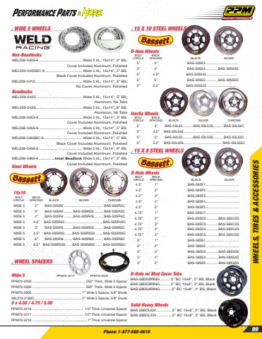 Phone: 1-877-560-0619WHEELS, TIRES & ACCESSORIES99WIDE 5 WHEELSWHEEL SPACERS15 X 10 STEEL WHEELS15 X 8 STEEL WHEELSWide 5PPM70-2250 ....................................................... .250%u201d Thick, Wide 5 SpacerPPM70-2500 ....................................................... .500%u201d Thick, Wide 5 SpacerPPM70-2000 .................................................... 1%u201d Wide 5 Spacer, 5/8%u201d StudsWIL270-2189C ................................................. 2%u201d Wide 5 Spacer, 5/8%u201d Studs5 x 4.50 / 4.75 / 5.00PPM70-4216 ...................................................... 1/4%u201d Thick Universal SpacerPPM70-4217 ...................................................... 1/2%u201d Thick Universal SpacerPPM70-4219 ..........................................................1%u201d Thick Universal SpacerPPM70-4217 PPM70-2000Non-BeadlocksWEL559-5405-6 ..........................................Wide 5 XL, 15x14%u201d, 5%u201d BS,Cover Included Aluminum, PolishedWEL559-5405BC-6 ....................................Wide 5 XL, 15x14%u201d, 5%u201d BS,Black Cover Included Aluminum, PolishedWEL559-5415.................................................Wide 5 XL, 15x14%u201d, 5%u201d BS,No Cover, Aluminum, PolishedBeadlocksWEL559-5425.............................................Wide 5 XL, 15x14%u201d, 5%u201d BS,Aluminum, No TabsWEL559-5426.............................................Wide 5 XL, 15x14%u201d, 6%u201d BS,Aluminum, No TabsWEL559-5453-6 .............................................Wide 5 XL, 15x14%u201d, 3%u201d BS,Cover Included Aluminum, PolishedWEL559-5455-6 .............................................Wide 5 XL, 15x14%u201d, 5%u201d BS,Cover Included Aluminum, PolishedWEL559-5455BC-6........................................Wide 5 XL, 15x14%u201d, 5%u201d BS,Black Cover Included Aluminum, PolishedWEL559-5456-6 .............................................Wide 5 XL, 15x14%u201d, 6%u201d BS,Cover Included Aluminum, PolishedWEL559-5465-6 ................Inner Beadlock Wide 5 XL, 15x14%u201d, 5%u201d BS,Cover Included Aluminum, PolishedWIDE 5 2%u201d BAS-50SR2 ......................................... BAS-50SR2CWIDE 5 3%u201d BAS-50SR3 .........BAS-50SR3S ......... BAS-50SR3CWIDE 5 4%u201d BAS-50SR4 .........BAS-50SR4S ......... BAS-50SR4CWIDE 5 4.5%u201d BAS-50SR45 ....................................... BAS-50SR45CWIDE 5 5%u201d BAS-50SR5 .........BAS-50SR5S ......... BAS-50SR5CWIDE 5 5.5%u201d BAS-50SR55 .......BAS-50SR55S ....... BAS-50SR55CWIDE 5 6%u201d BAS-50SR6 .........BAS-50SR6S ......... BAS-50SR6CWIDE 5 6.5%u201d BAS-50SR565 ......BAS-50SR65S ....... BAS-50SR65CBLACK SILVER CHROMEBOLTCIRCLEBACKSPACING15x10Steel Wheels4.5%u201d 1%u201d BAS-58SF1...................................4.5%u201d 2%u201d BAS-58SF2...................................4.5%u201d 3%u201d BAS-58SF3...................................4.5%u201d 4%u201d BAS-58SF4...................................4.5%u201d 5%u201d BAS-58SF5...................................4.75%u201d 1%u201d BAS-58SC1...................................4.75%u201d 2%u201d BAS-58SC2.............BAS-58SC2S4.75%u201d 3%u201d BAS-58SC3.............BAS-58SC3S4.75%u201d 4%u201d BAS-58SC4.............BAS-58SC4S4.75%u201d 5%u201d BAS-58SC5.............BAS-58SC5S5%u201d 1%u201d BAS-58S51...................................5%u201d 2%u201d BAS-58S52...................................5%u201d 3%u201d BAS-58S53.............BAS-58S53S5%u201d 4%u201d BAS-58S54.............BAS-58S54S5%u201d 5%u201d BAS-58S55.............BAS-58S55SBLACK SILVERBOLTCIRCLEBACKSPACINGD-Hole WheelsD-Hole w/ Mud Cover TabsBAS-58D52IRING ..........5%u201d BC 15x8%u201d, 2%u201d BS, BlackBAS-58D53IRING ..........5%u201d BC 15x8%u201d, 3%u201d BS, BlackBAS-58D54IRING ...........5%u201d BC 15x8%u201d, 4%u201d BS, BlackSolid Heavy WheelsBAS-58SOLID2 .............. 5%u201d BC 15x8%u201d, 2%u201d BS, BlackBAS-58SOLID3 .............. 5%u201d BC 15x8%u201d, 3%u201d BS, Black5%u201d 3%u201d BAS-50S53..................................5%u201d 4%u201d BAS-50S54.............BAS-50S54S5%u201d 4.5%u201d BAS-50S545.................................5%u201d 5%u201d BAS-50S55.............BAS-50S55S5%u201d 5.5%u201d BAS-50S555.................................BLACK SILVERBOLTCIRCLEBACKSPACINGD-Hole WheelsInertia Wheels5%u201d 4%u201d BAS-50L54...........BAS-50L54S...........BAS-50L54C5%u201d 4.5%u201d BAS-50L545...............................................................5%u201d 5%u201d BAS-50L55...........BAS-50L55S...........BAS-50L55C5%u201d 5.5%u201d BAS-50L555.........................................BAS-50L555C BLACK SILVER CHROMEBOLTCIRCLEBACKSPACING